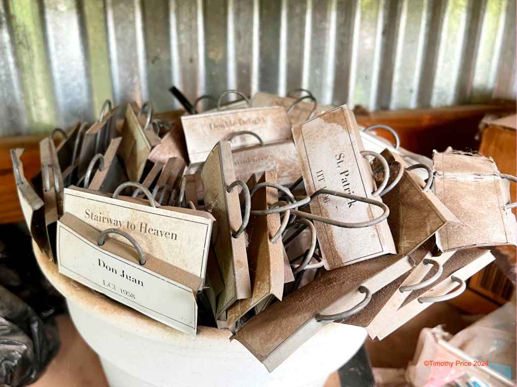 A pot full of name tags from all our roses that have died over the years, mainly due to late hard frosts.
