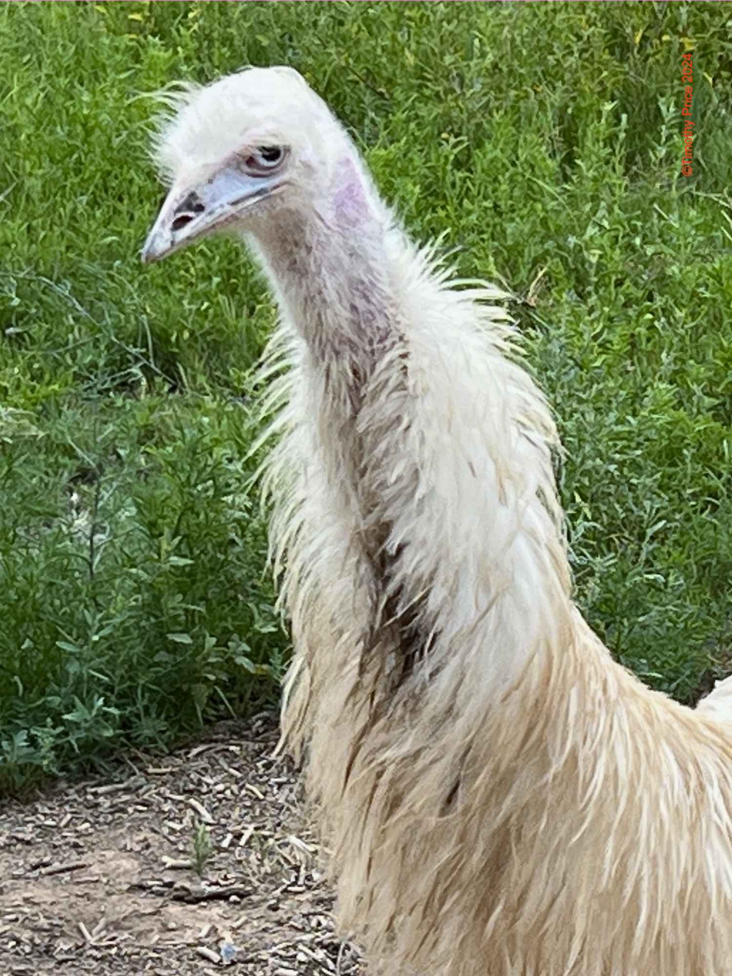 While I was out riding this afternoon, I happened across a white Emu. Apparently, white Emus are rare, and this one might be albino. She was happy to pose for a fashion shoot but not happy when a big white dog ran up barking, interrupting our photo session. Ms Emu took no time to show señor Perro how she felt about him butting in on her fashion shoot and promptly pecked him on his butt. Then she chased him into a dugout and came back for more photos.