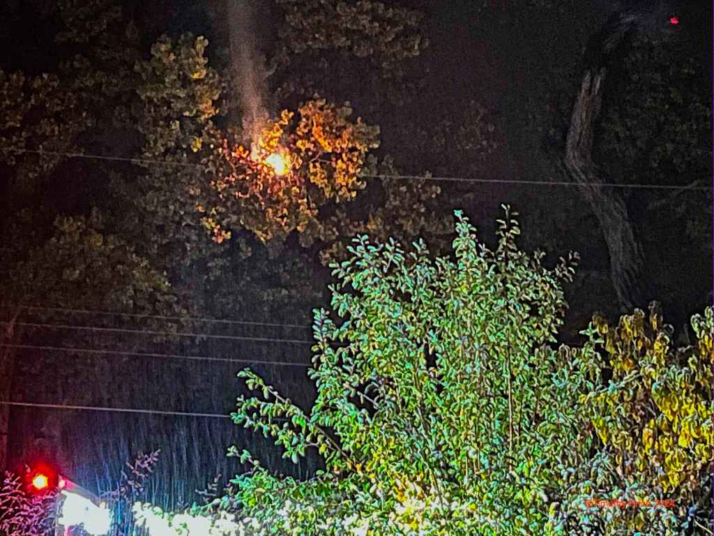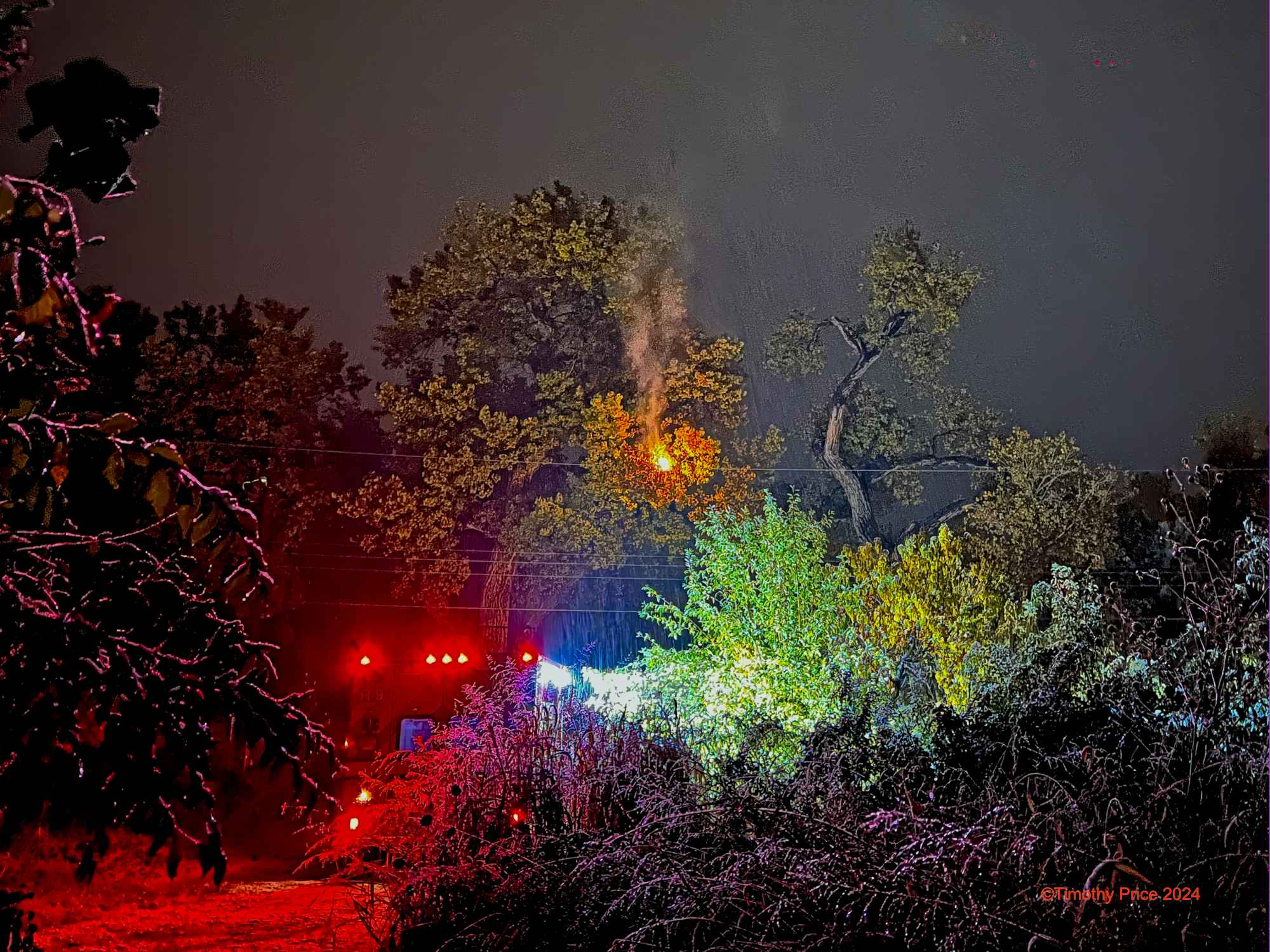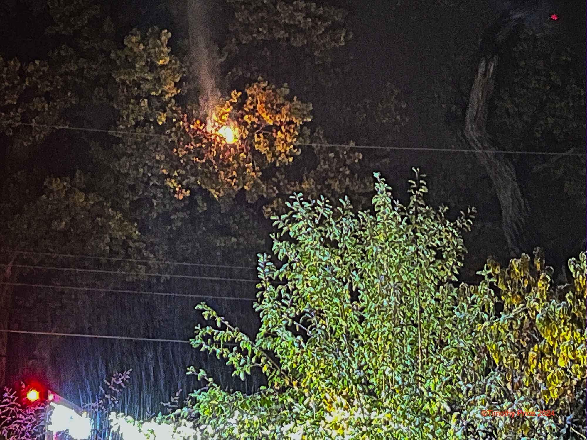 Only one fire crew is left watching the fire. The other firemen had to respond to more fires. Wet conditions should keep the fire from spreading further into the tree. The firemen will not attempt to extinguish the fire because they could be electrocuted.