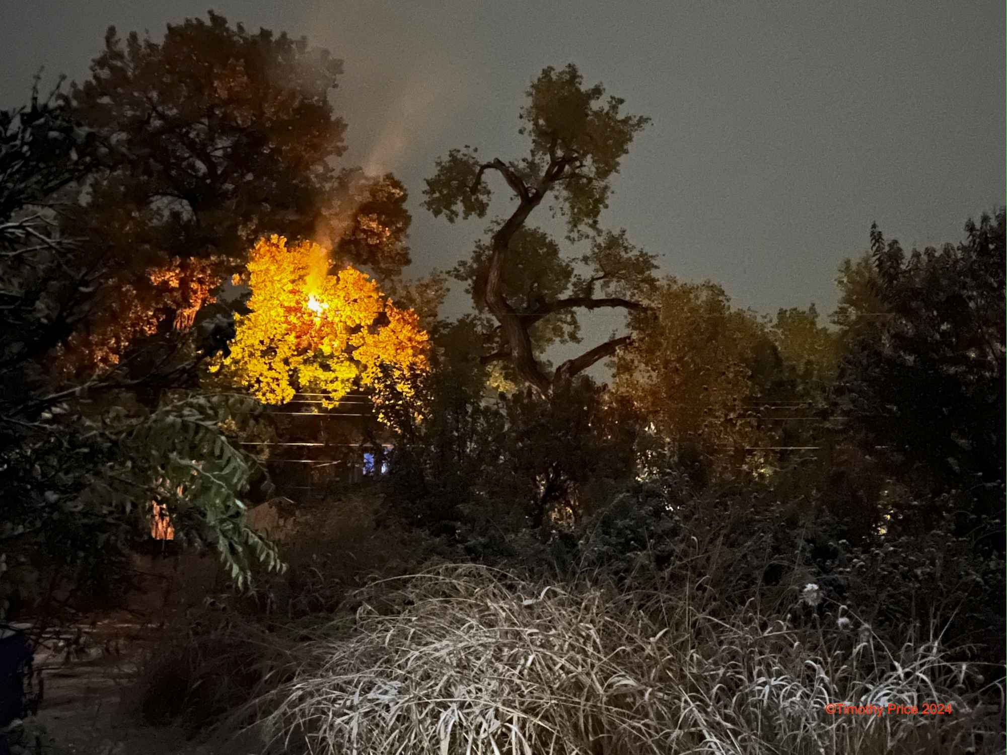 Late breaking news. The neighbor’s tree is on fire once again. The snow is bowing the tree’s branches into the powerline. Fortunately, it’s the highline, so there is less chance of it causing a power outage.
