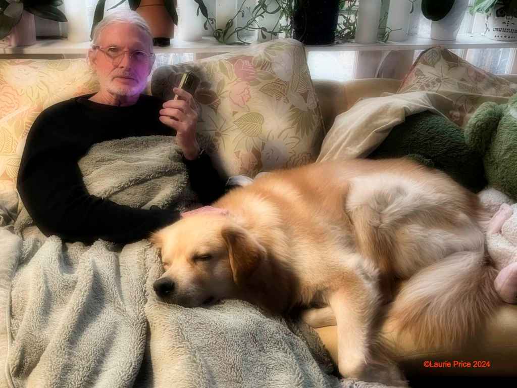 Jake looks like a great companion dog on a cold night. He will miss Grandpa Tim when his vacation in the Bosque ends.