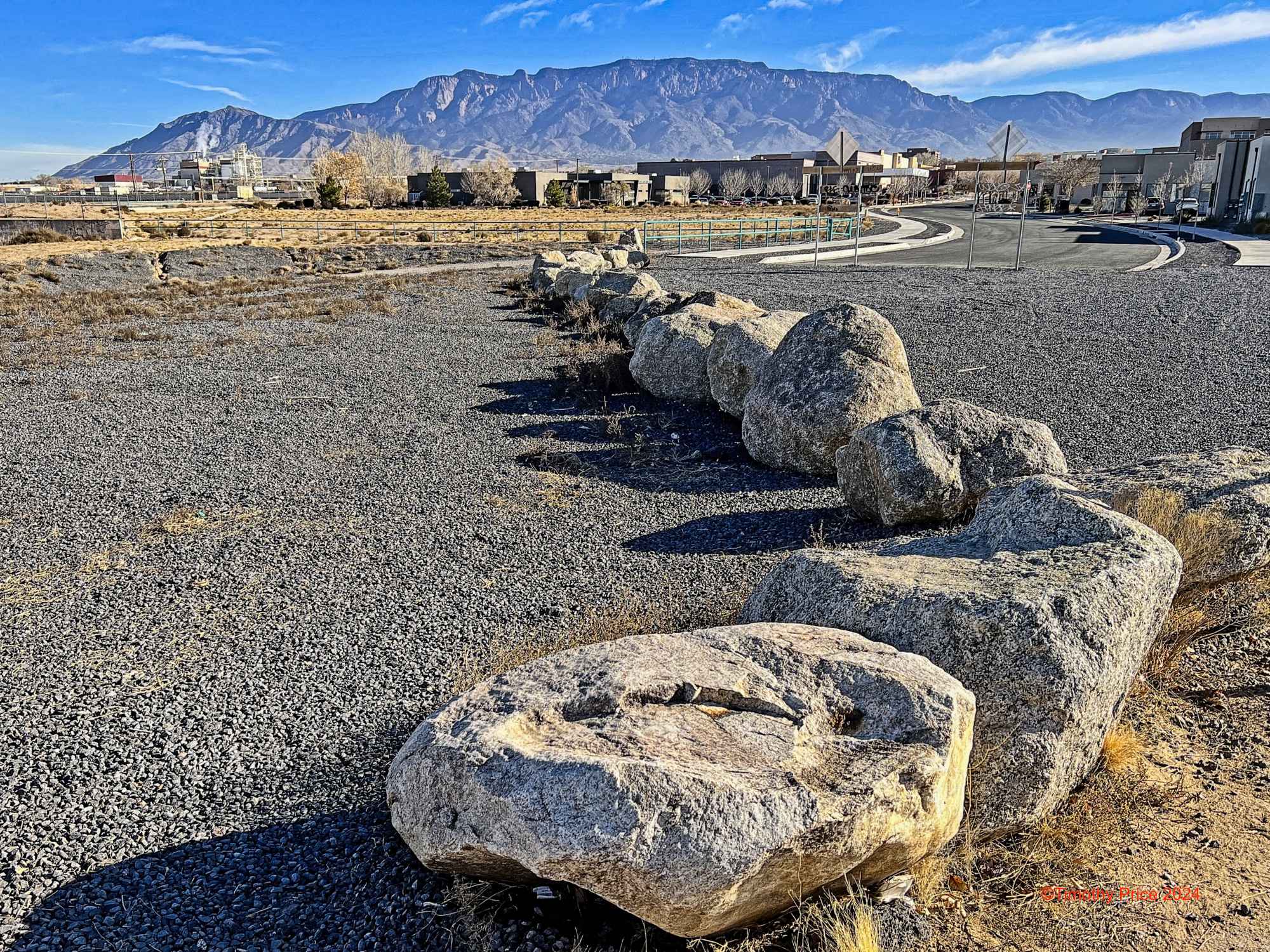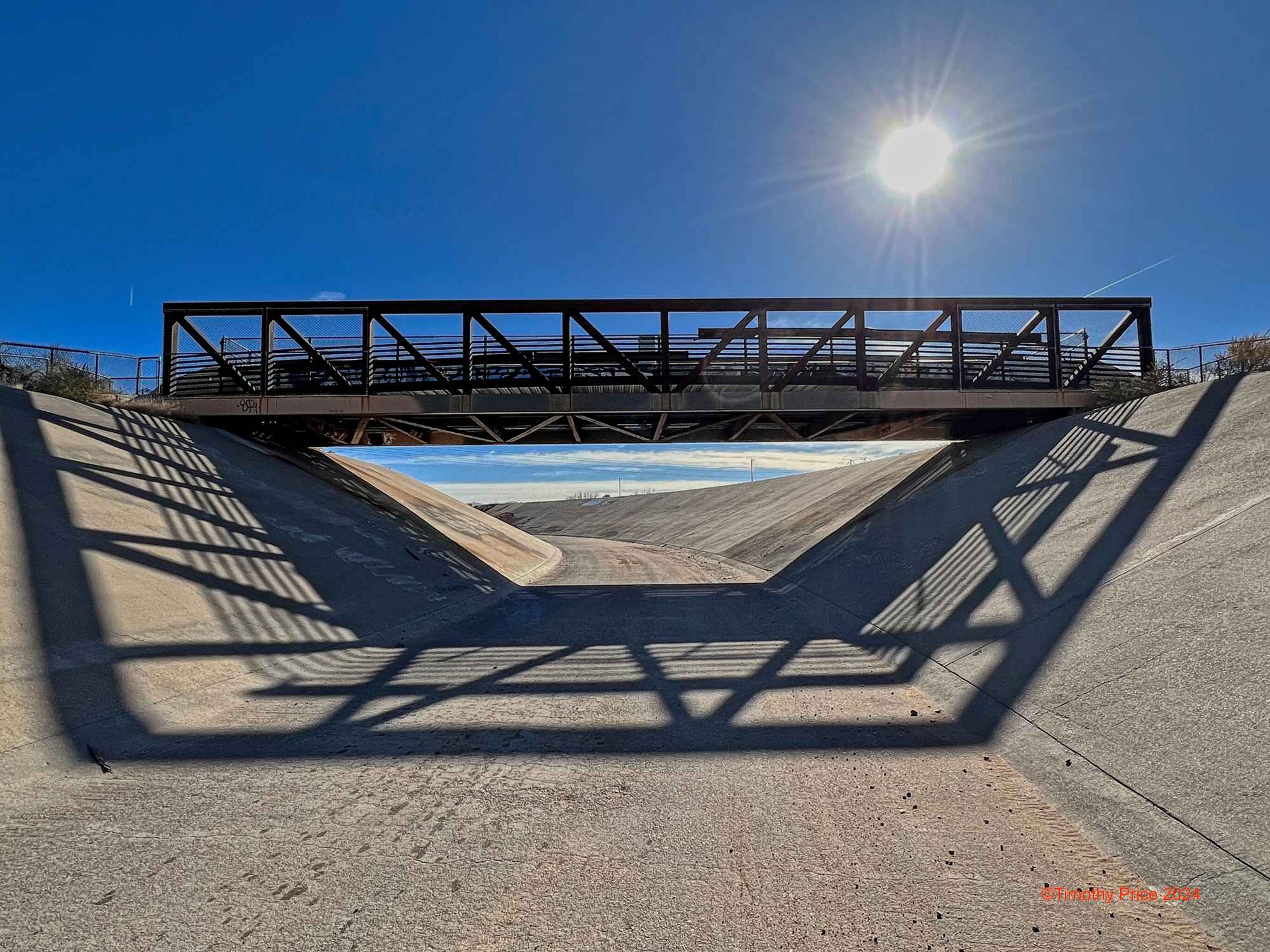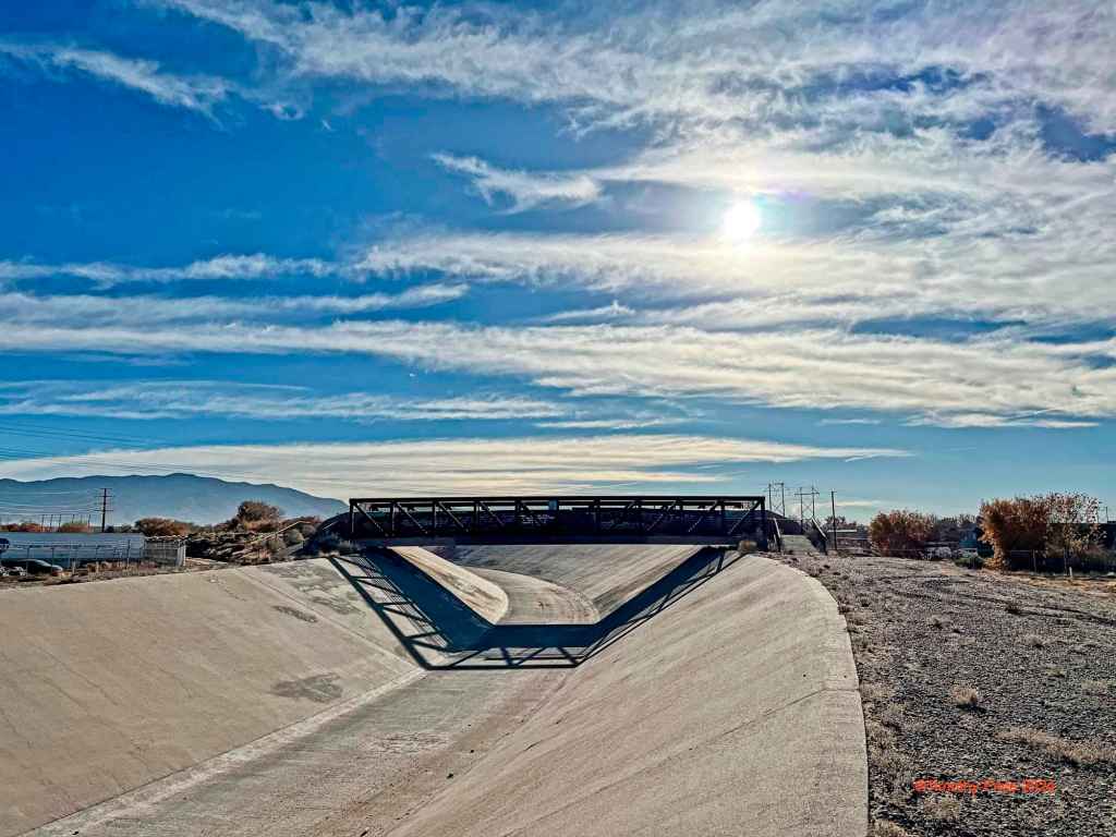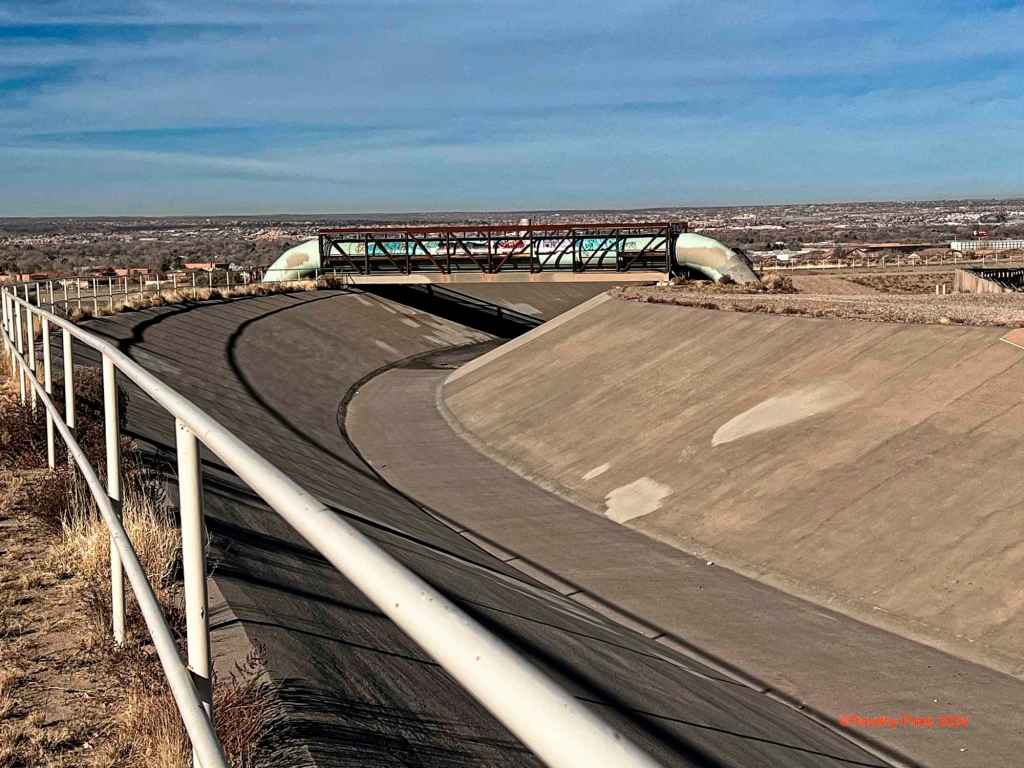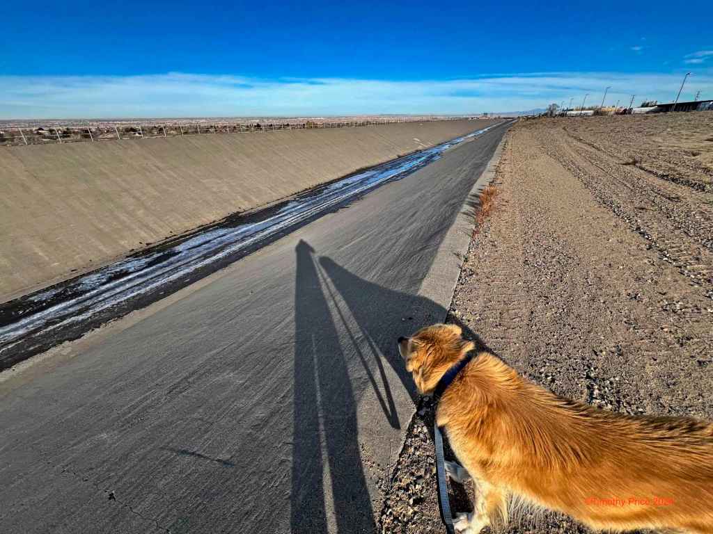 While my car was in the shop for maintenance, Jake and I took a 3.8-mile (6.1 Km) walk down, up, and all around the Albuquerque flood diversion channel. I was surprised how much Jake liked running down and up the steep sides of the flood control channels. Whenever we came up to the top of a channel, Jake would hop onto the road and give whatever was in front of us a look of intense interest. It was like a game for Jake.