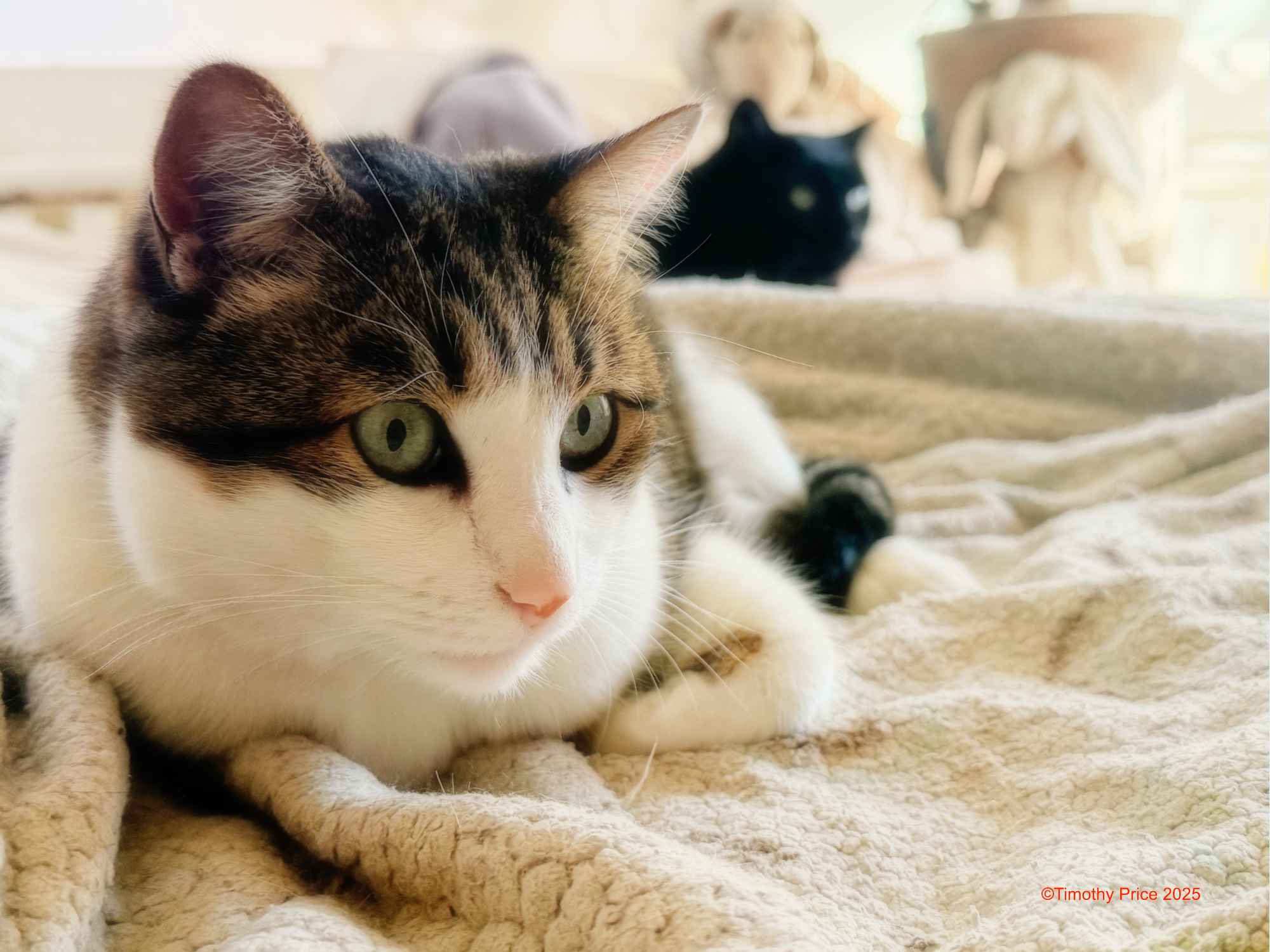 Spunk was so warm and comfy, he didn’t change positions after I changed his calming collar. Genda watched from behind.