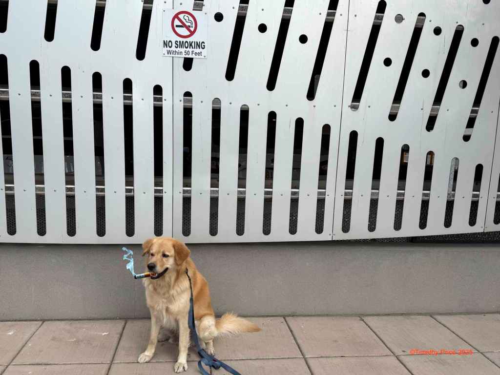 • It sure is. Jake, the rebel dog, had to have a smoke after making some grumpy guards in the federal building smile. It’s tough work being an emo dog. Thanks, DJV.