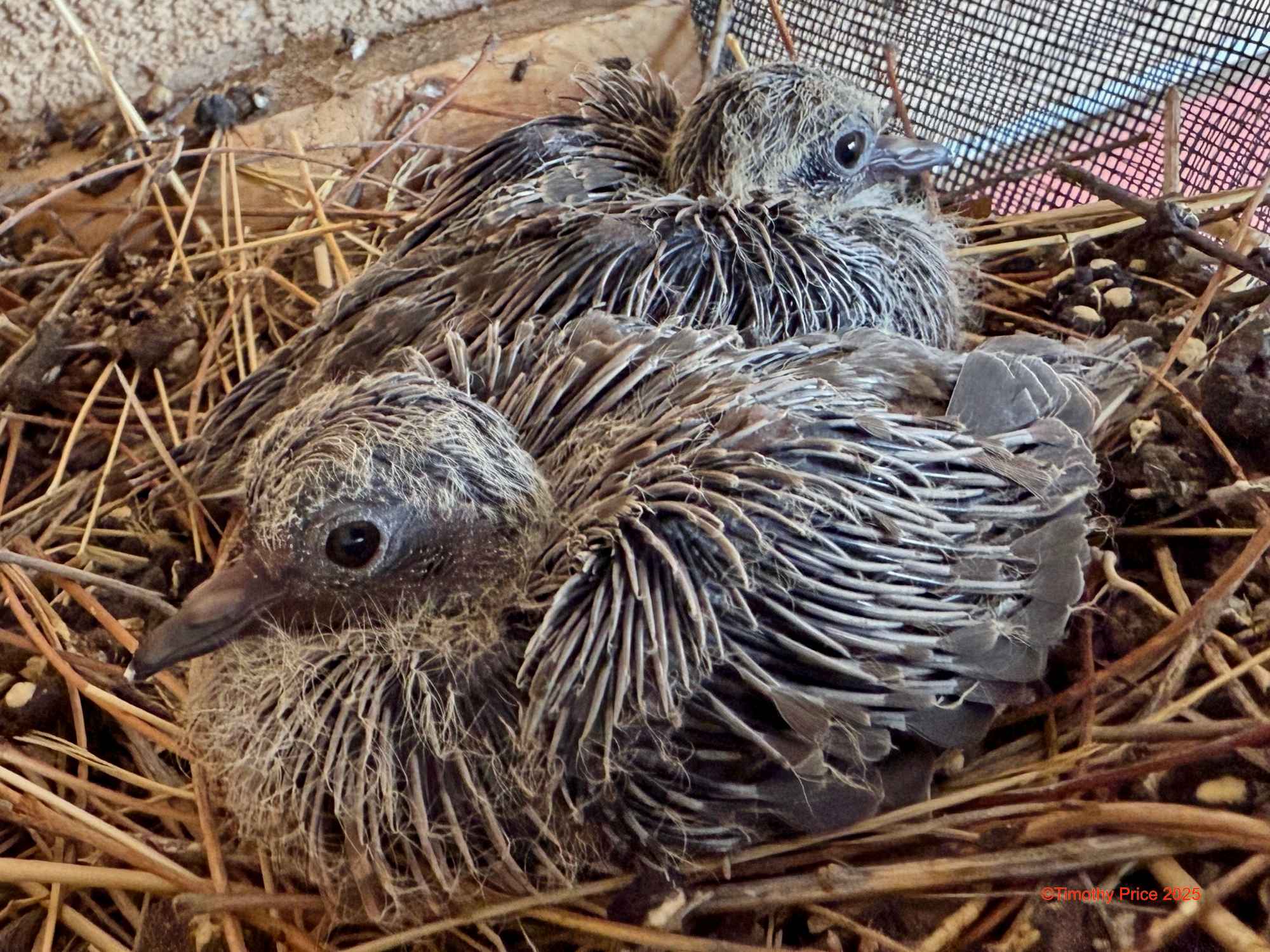 Pinfeather Doves March 27, 2025 Timothy Price35 Comments Thrashed Doves in pinfeathers growing up above the front door on Tristan’s house. Low sun in clouds