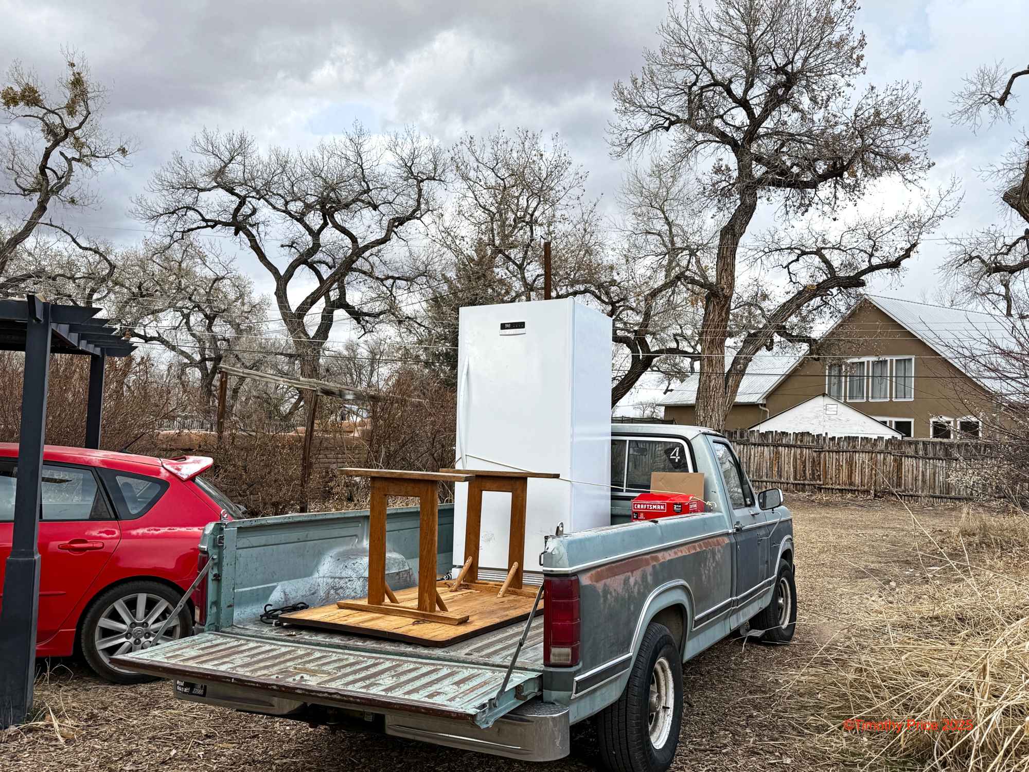 While the Village crew worked on waterlines, I hauled loads of household goods to Thrift Town, and then moved a solid oak table I built when I was 15 years old and a freezer to our house. The women at Thrift Town were gaga over Jake. He loved the attention.