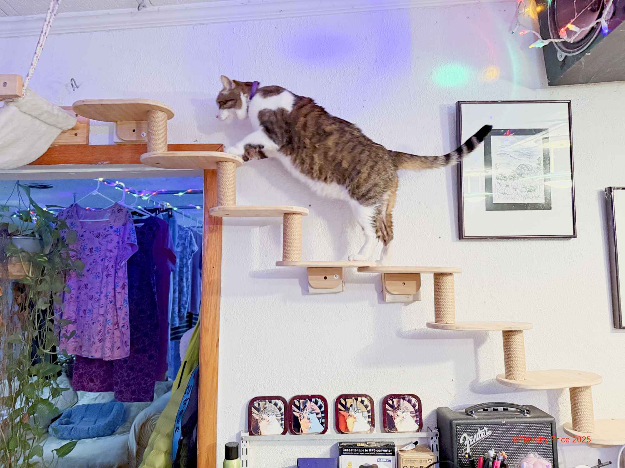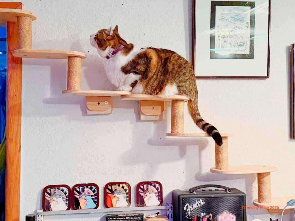 I replaced the cat stairs on the wall for the cats to get to the hammocks with two sets of prefab kitty stairs. The previous stairs I built from scrap would was made of mohagany. Belafante started to perch on the kitty stairs and chew on the wood. Mohagany in poisonous, so I repaced the stairs with a nno-toxic white wood. It was much less expensive to buy prefab kitty stairs than build new stairs from scratch.