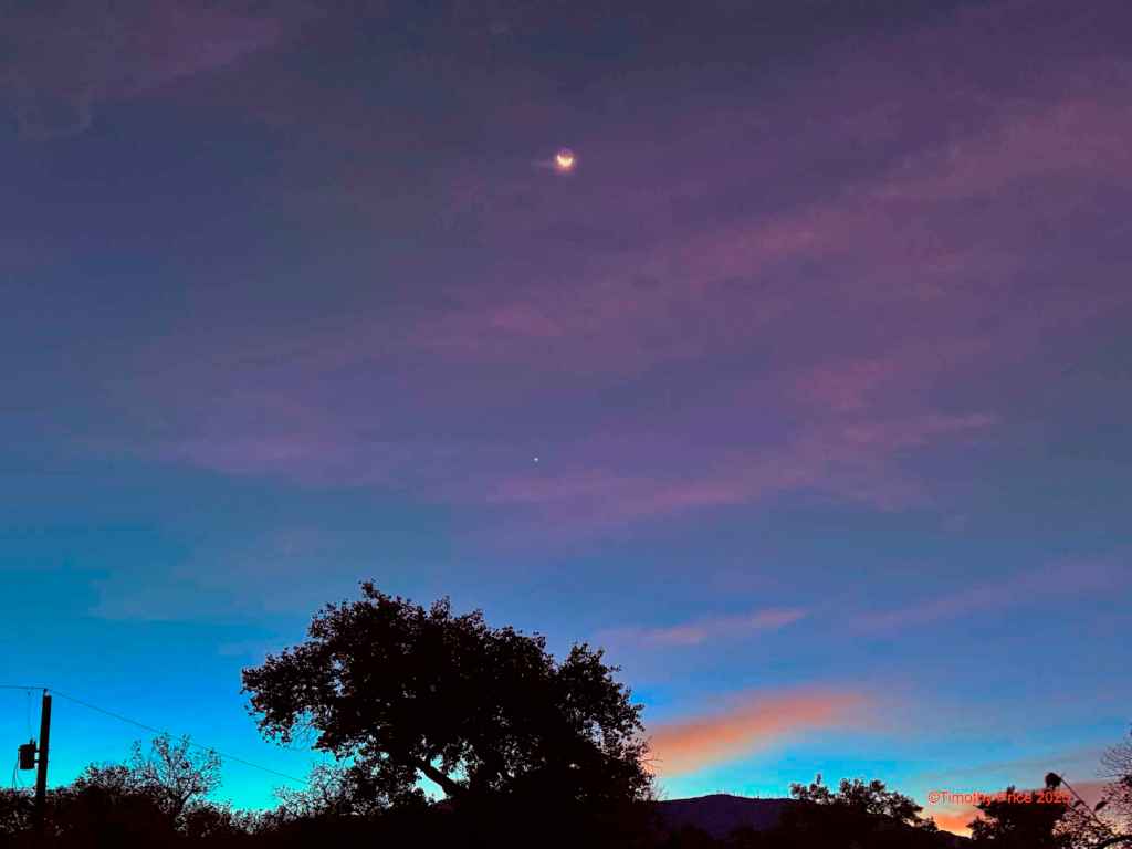 Resa’s Wolf Tree, Venus, and the crescent moon lined up at dawn