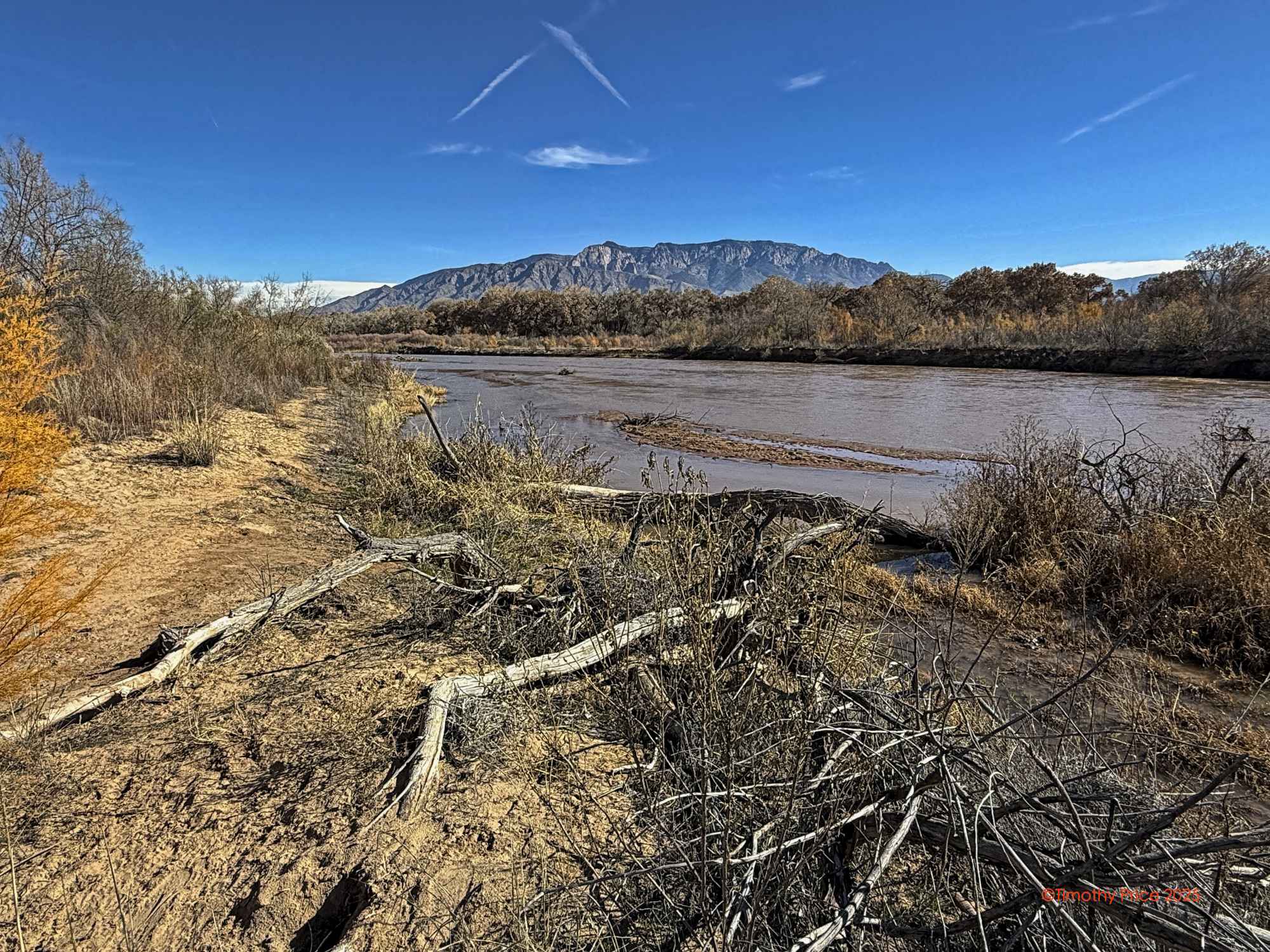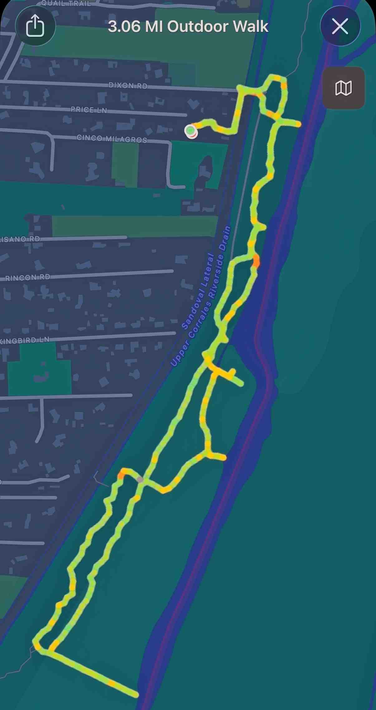 Well! Five point seven/eights miles to be more precise. While it’s only a mile and a half between mile marks as the river flows, and the treks to the river and back, plus all the winding around on different paths in the bosque added up. This was the longest walk Jake has made with me since he moved in.