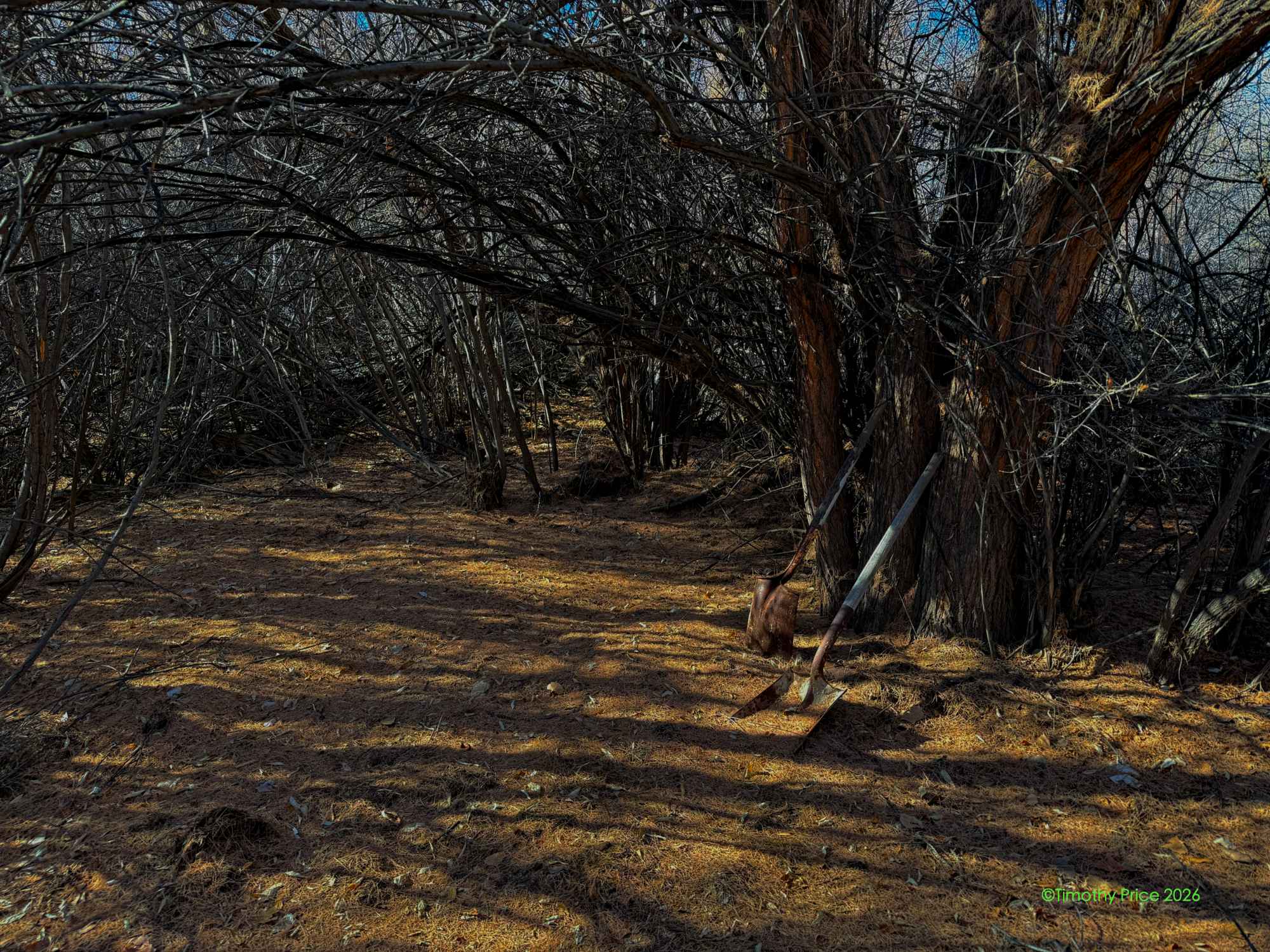 Jake and I ventured off down another coyote trail. We went as far as we could go and discovered a pair of shovels.