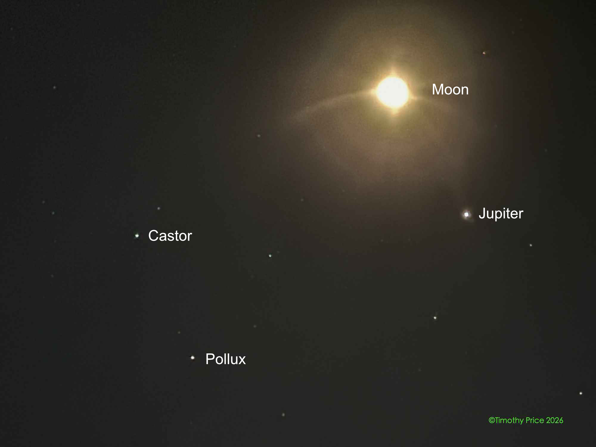 The moon and Jupiter partnered up to square dance with Castor and Pollux last night.