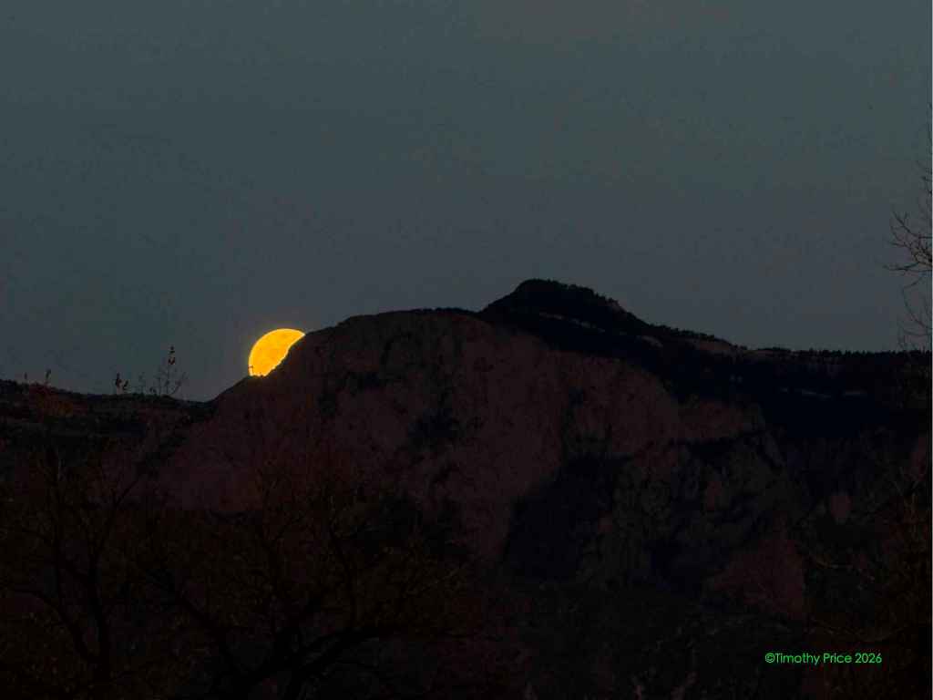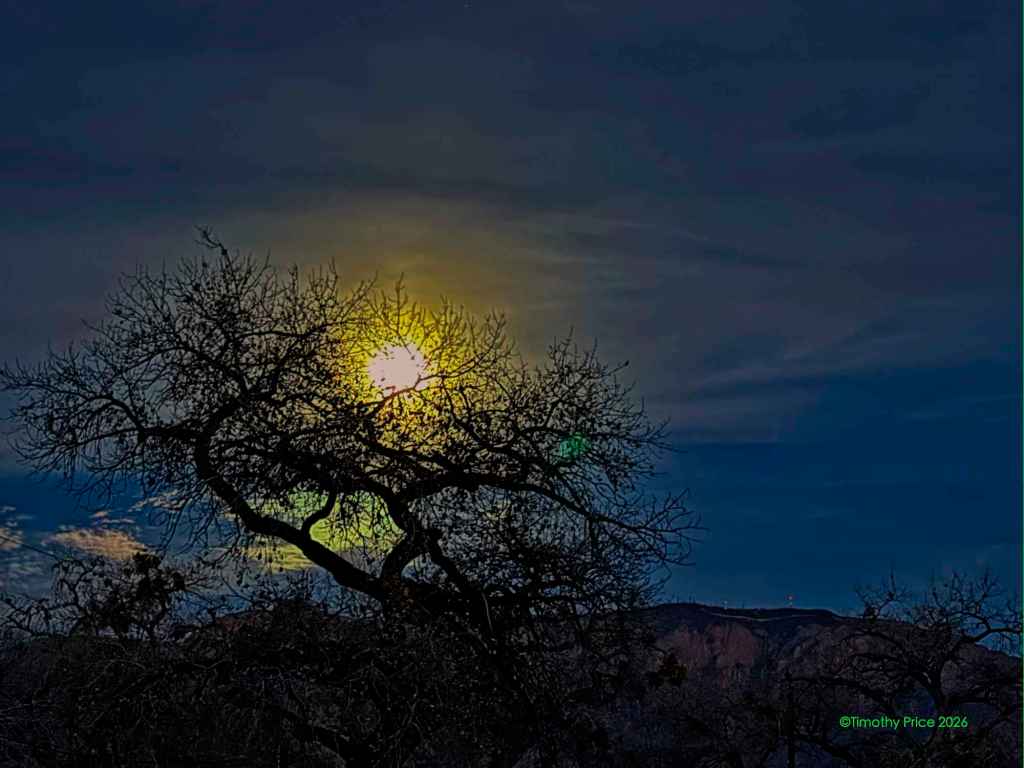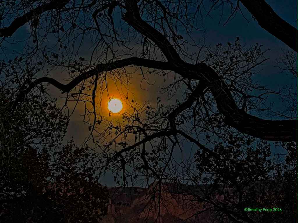 At 4:30 tomorrow morning MDT, there will be a full, bloody eclipse of the moon. If I wake up around 4:00 a.m., I’ll go out and see what I can see of it. The moon will be close to the horizon when it is fully eclipsed at 4:30, so I might not be able to see it through the trees.