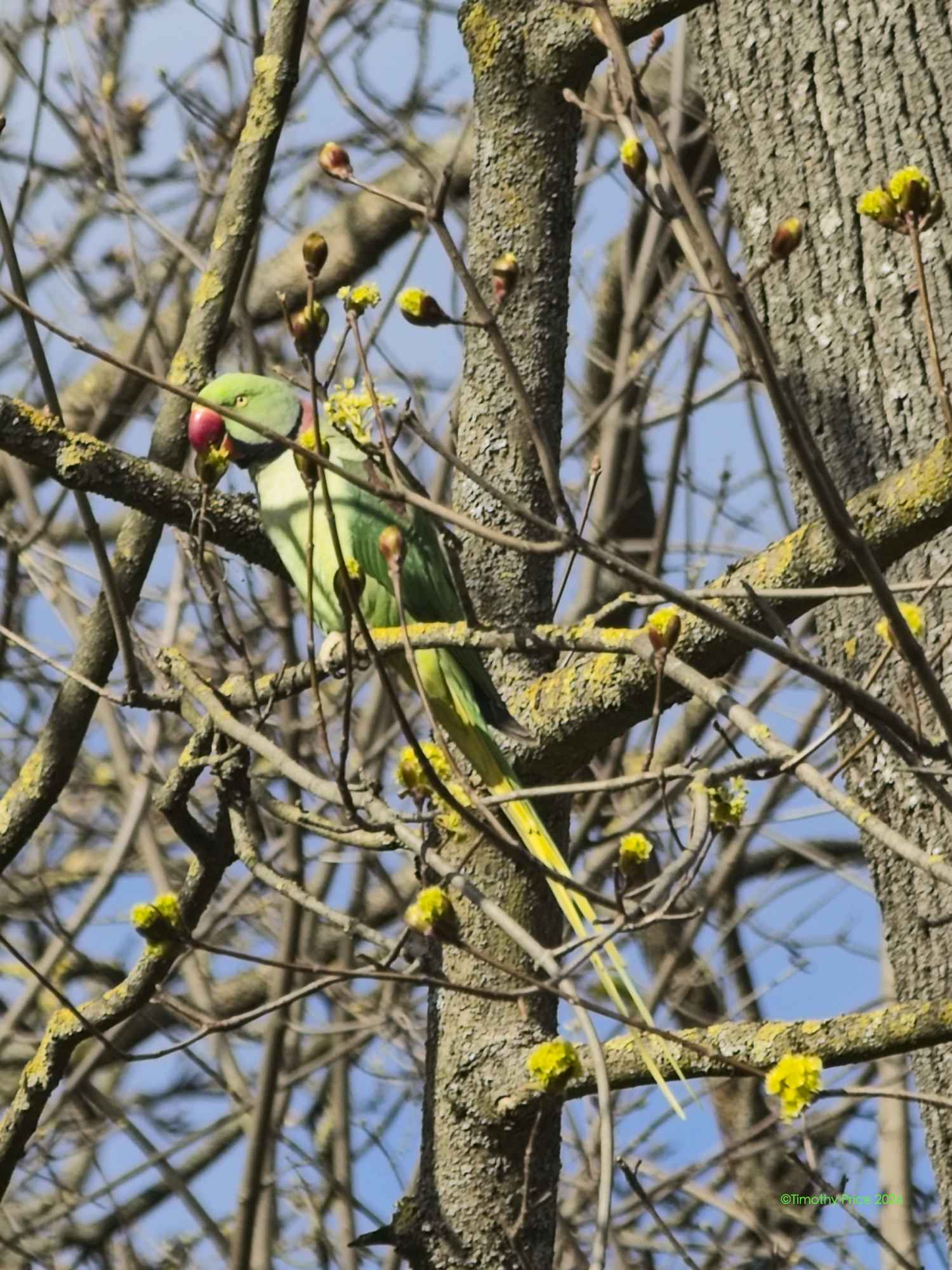 Alexandrine Parakeets were chirping in the trees. They are very large parakeets.