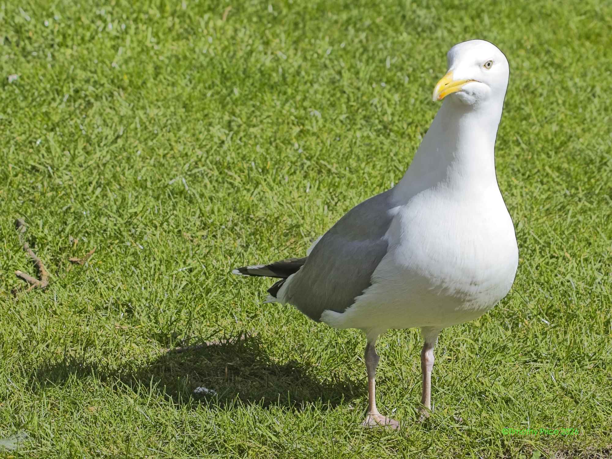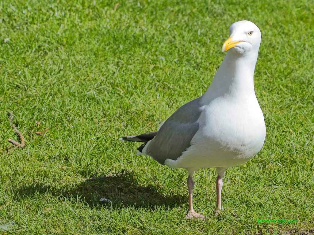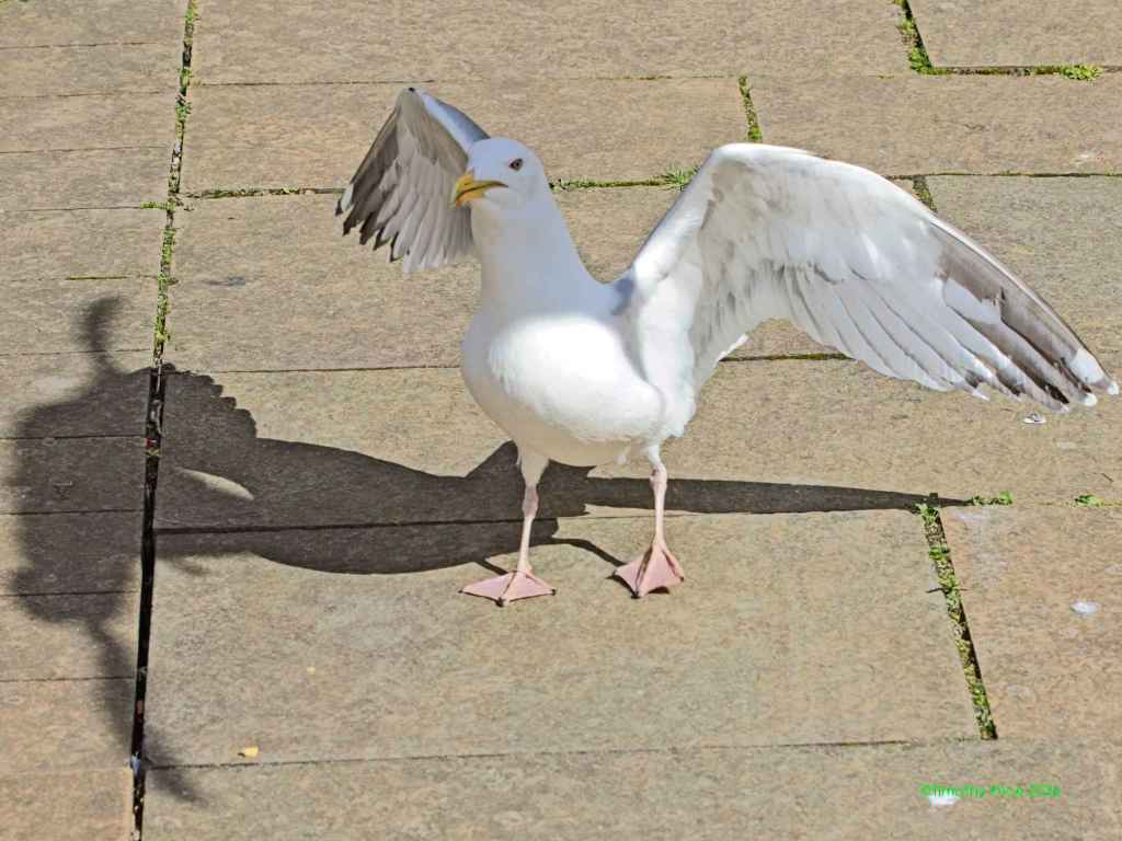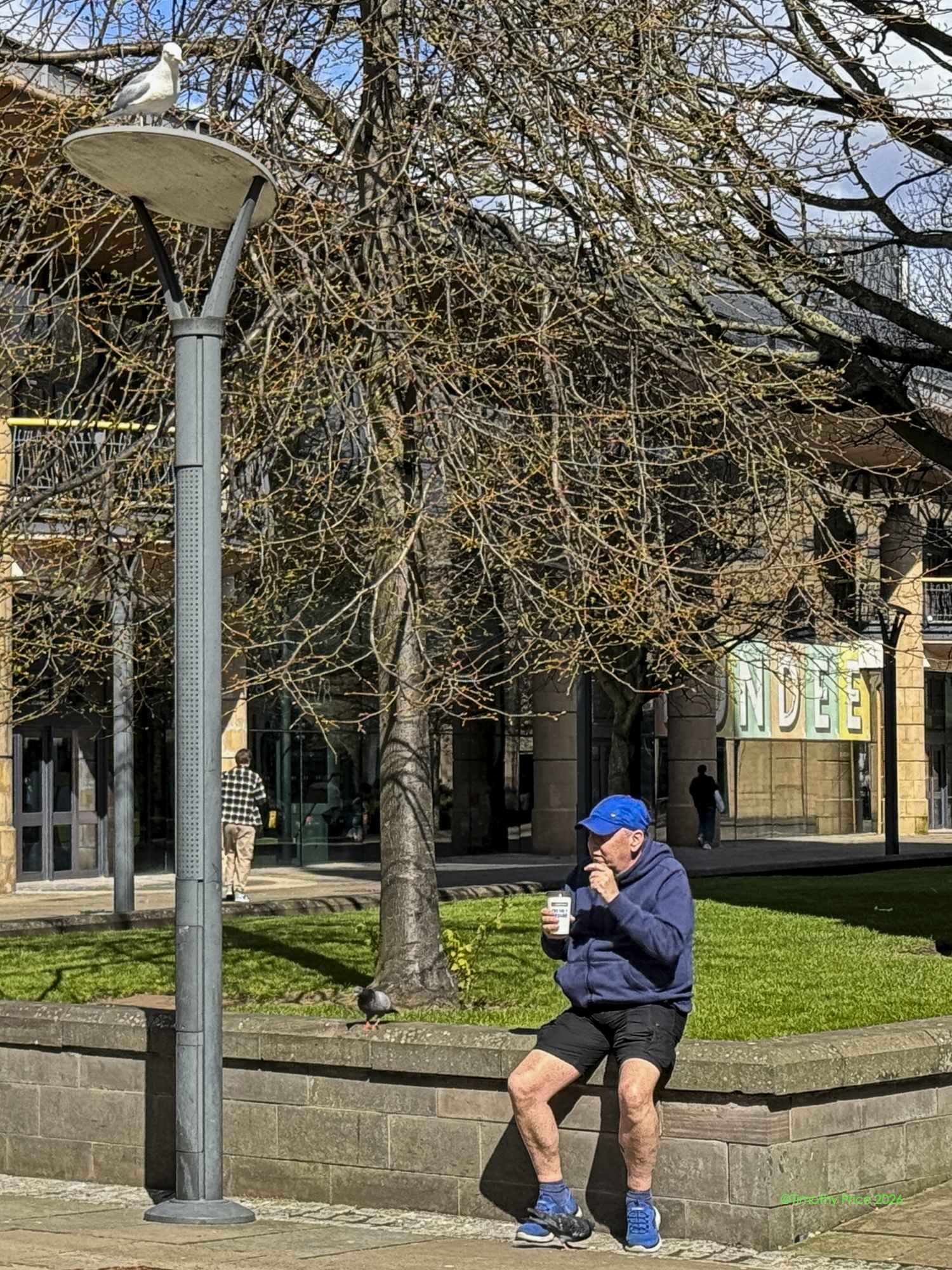The gull on the streetlight was eyeing the man’s food.