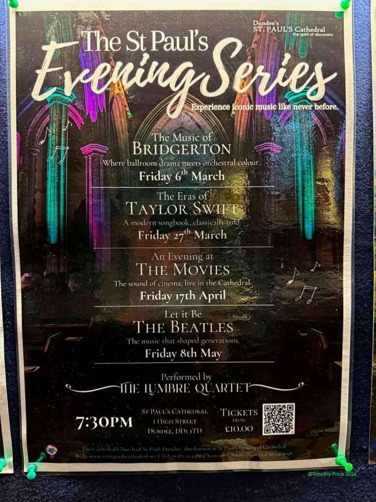 I spent a delightful last day in Dundee walking around with Shey and John. We visited St Paul’s Cathedral, a museum, and the V&A. Then I stayed in the V&A until it was time to catch the bus to Edinburgh.