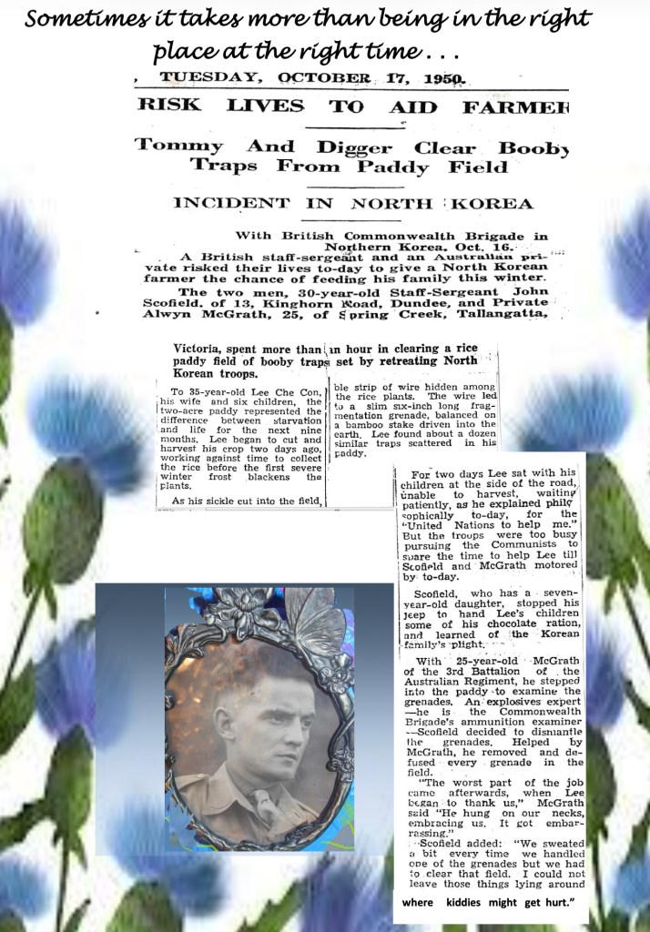 “It was just wonderful having you visit Timothy. And I was actually really touched by your interest in my dad’s handiwork. Of course when I was wee I never thought Dad was anything other than just my dad, the guy who could fix anything, for anyone . A molder to trade, he had such nimble fingers, I’d actually bring him all the broken toys from the kids round about and ask if he’d mend them. And he did. It was why when I was eight and he offered to make me a dolls house for my birthday –well I had to pick the most complicated plans in the model making shop, a Tudor mansion because of course he could make and mend anything. I didn’t know about his very difficult upbringing, his mother dying when he was four, that his father was the family black sheep of a reasonably well to do family, that Dad left his reserved trade occupation, in order to serve his country in three conflicts in bomb disposal, thought nothing of nearly giving his life to save a North Korean peasant family while fighting for the UN against the North because retreating Northern troops had mined their paddy field–their only source of food, in addition to trying and failing to save the life of a young man whose leg had been blown off in that same conflict. I just knew he was my Dad who could fix anything. And in my mind, he’s still that to me. In a world that wasn’t always kind to him , he was unfailing kind to all of those about him. Thank you Timothy for giving me the chance to talk about him.”