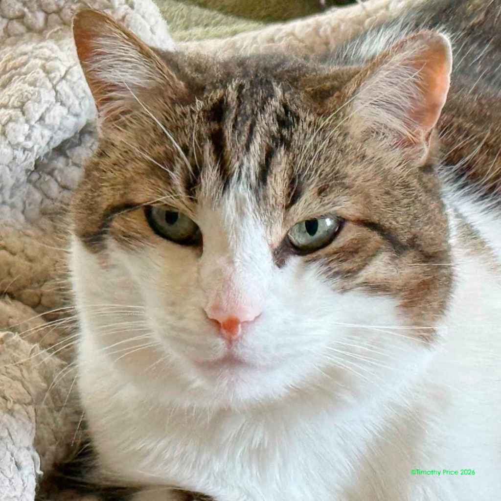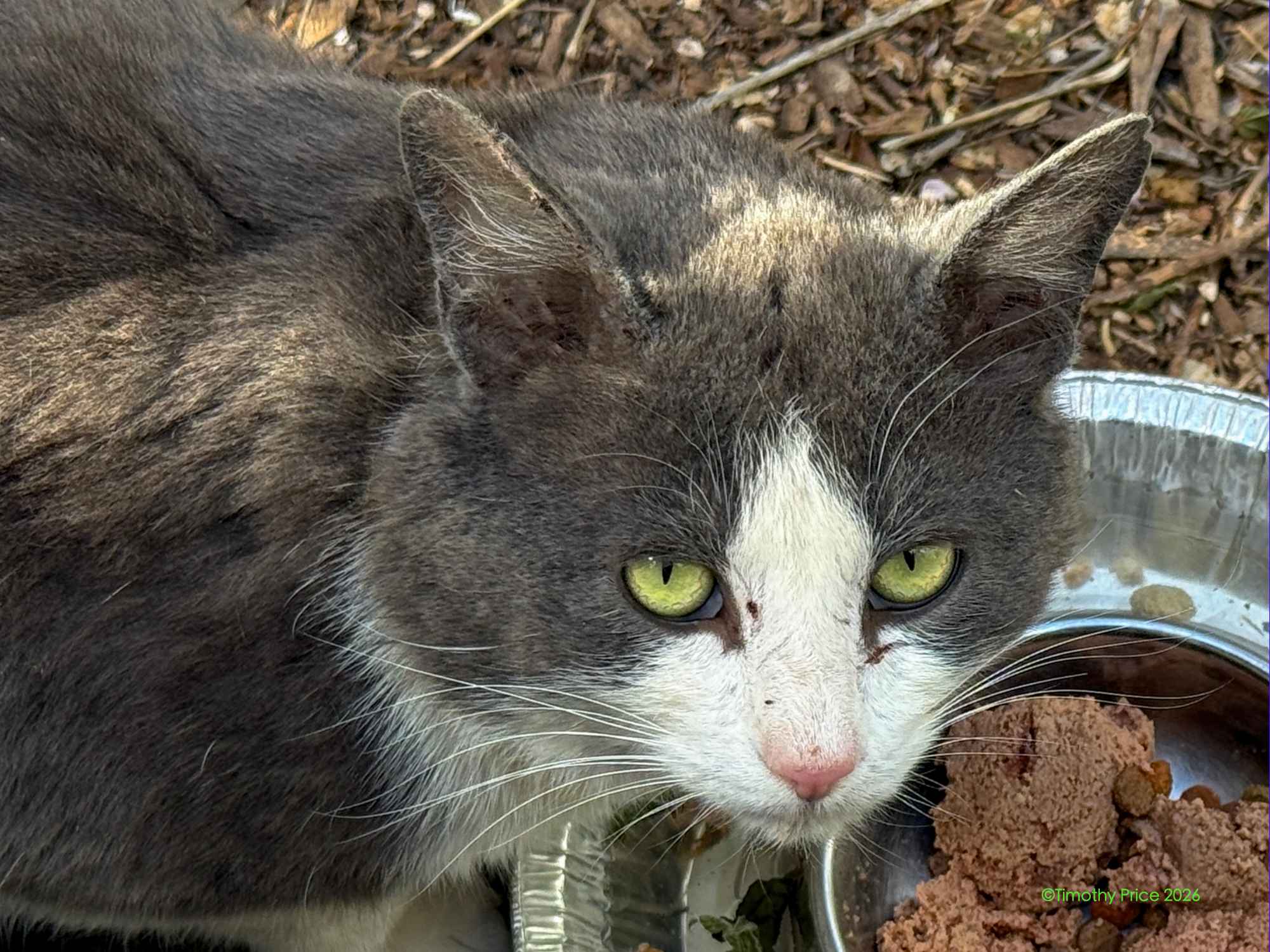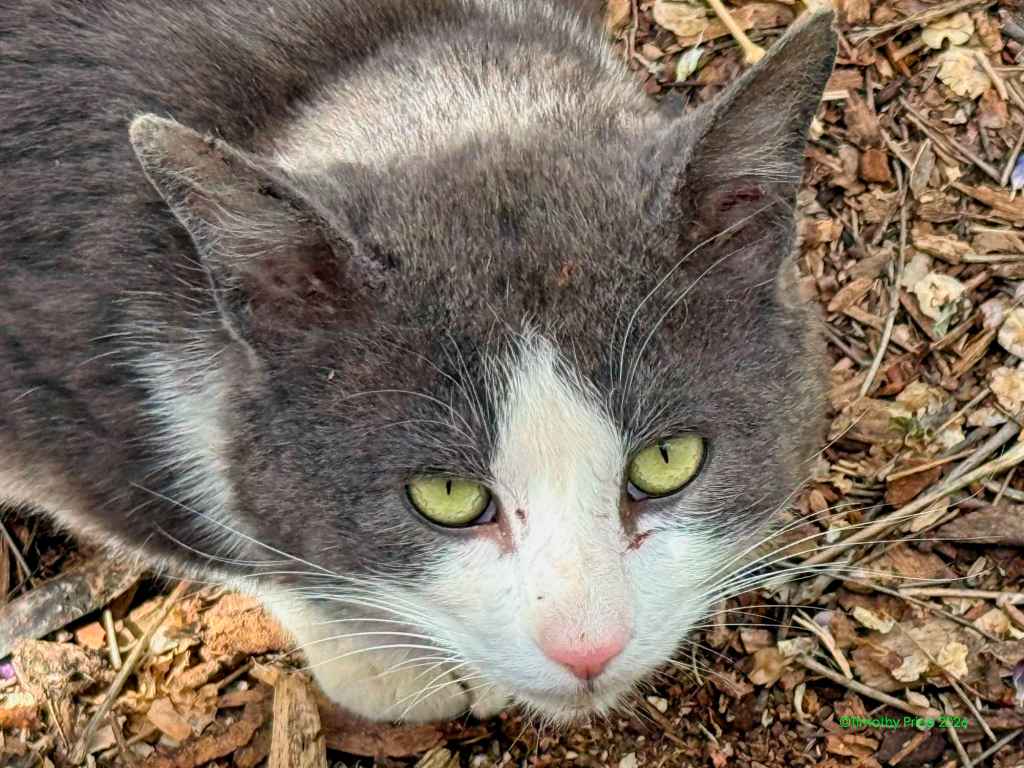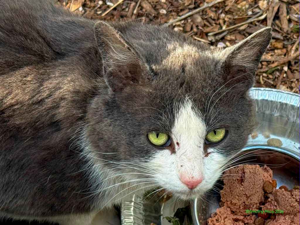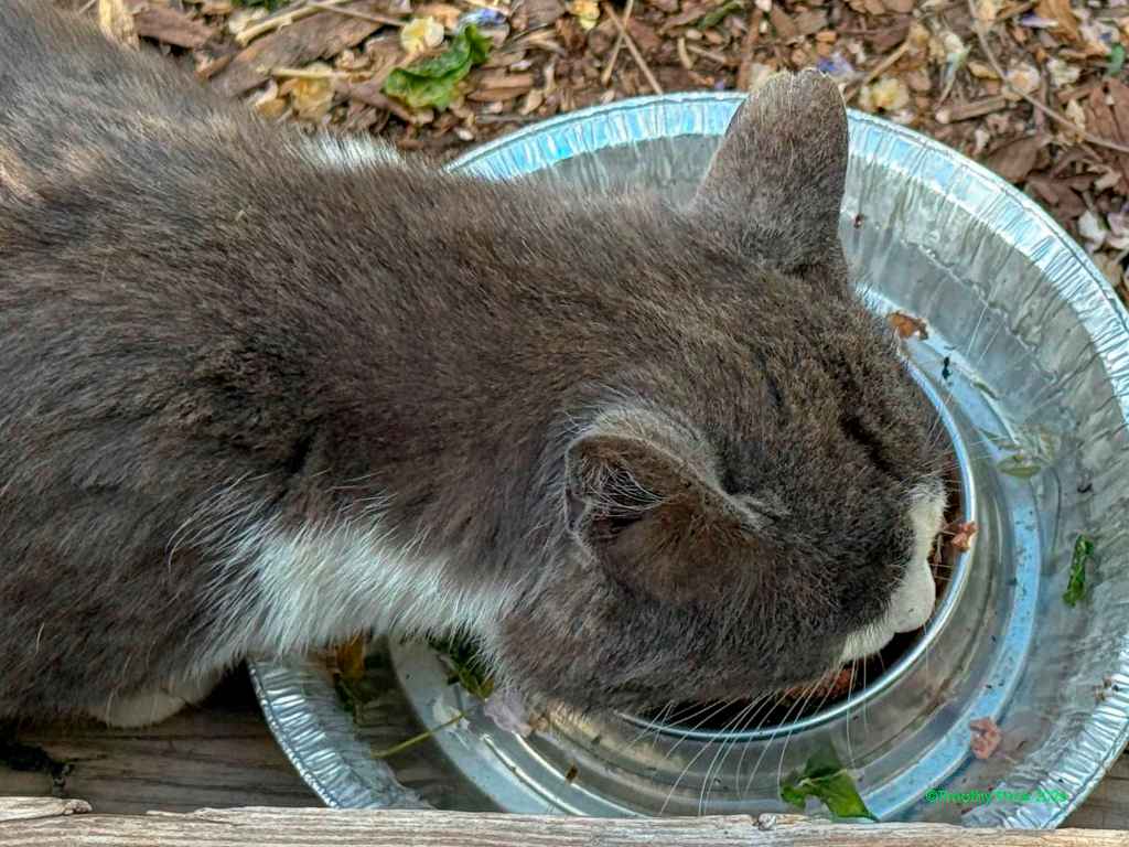 The mystery kitty started hanging around last summer, fighting with our cats through the wire in the catio. You can read more about that at https://wp.me/p1yQyy-cr8. He has always run away from us whenever he sees us, but Laurie noticed he’d been looking thin, so she started leaving food and water out for him. He was meowing at the Sally port door this afternoon, and our cats were not fighting with him through the wire. I walked out the door and he ran. I sat down on the step and called him. He slowly came back, sniffed me, got up on the step next to me, and let me pet him for a few seconds before he ran off again. I went back inside and in a few minutes he was meowing at the door again. I took a can of cat food out and put it in his food bowl, and he really appreciated the canned food. I sat on the step with him eating at my feet and took a few photos. He definitely looks rougher than he did when we first started seeing him last summer.