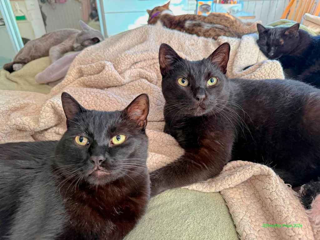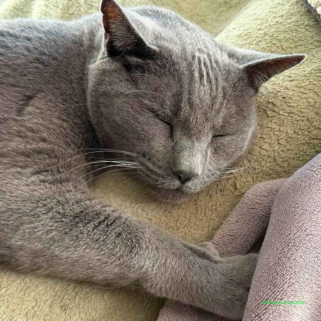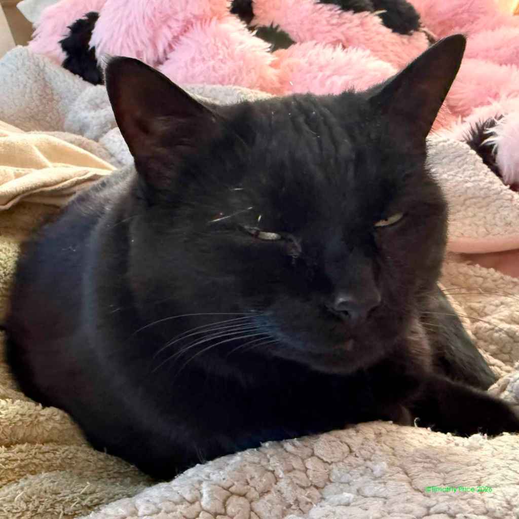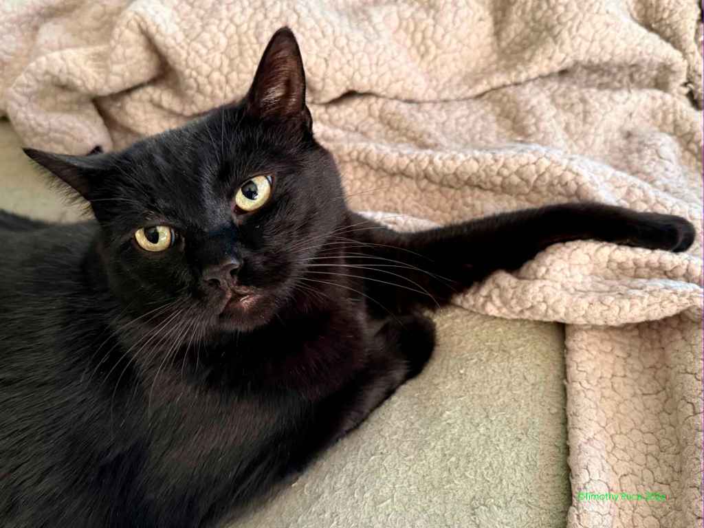 The mystery kitty started hanging around last summer, fighting with our cats through the wire in the catio. You can read more about that at https://wp.me/p1yQyy-cr8. He has always run away from us whenever he sees us, but Laurie noticed he’d been looking thin, so she started leaving food and water out for him. He was meowing at the Sally port door this afternoon, and our cats were not fighting with him through the wire. I walked out the door and he ran. I sat down on the step and called him. He slowly came back, sniffed me, got up on the step next to me, and let me pet him for a few seconds before he ran off again. I went back inside and in a few minutes he was meowing at the door again. I took a can of cat food out and put it in his food bowl, and he really appreciated the canned food. I sat on the step with him eating at my feet and took a few photos. He definitely looks rougher than he did when we first started seeing him last summer.
