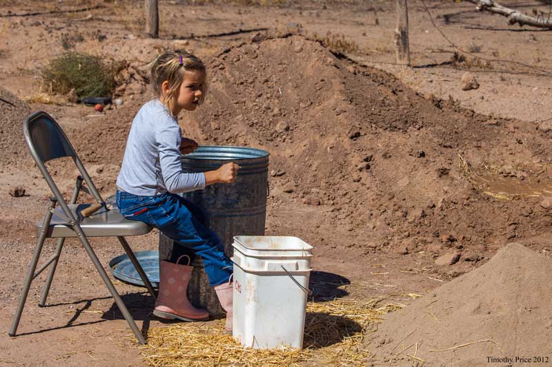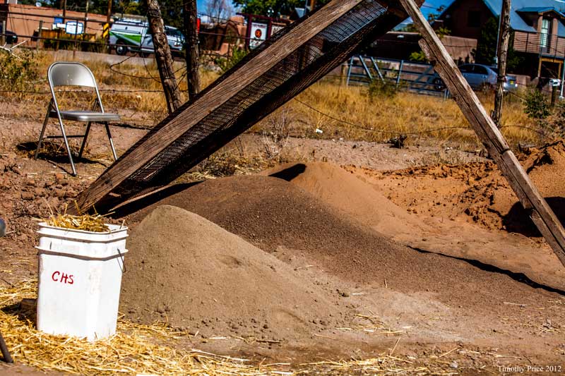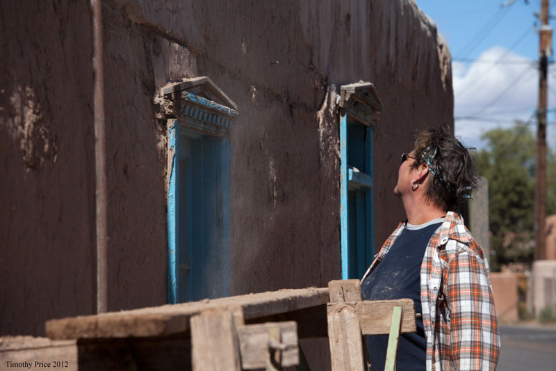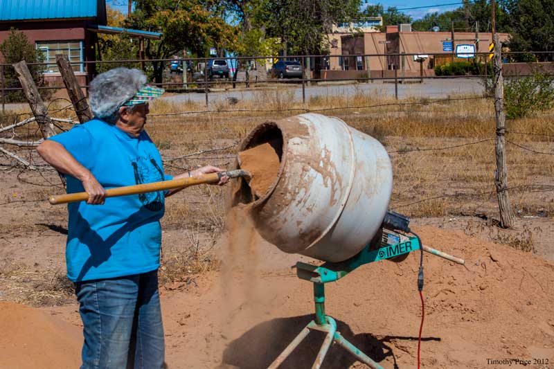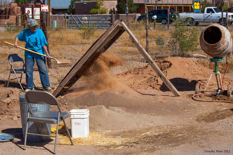 The old Martinez house is historic, and maintaining the mud plaster at a reasonable cost takes volunteers who are willing to donate a day or two of hard labor. The first eight photos in the series illustrate part of the process. The first photo shows the north wall ready for new mud plaster. The cracked mud around the window and door is new mud put on last week to replace loose plaster and even out the walls in preparation for new mud. The second photo shows Mary Davis, the organizer of the Mud Plaster Workshop, sifting dirt to separate out rocks, sticks and dirt clods. The third photo shows a pile of sand, a pile of sifted caliche and a pile of sifted fine “wind blown” red clay used to make the mud plaster. The mixture they were using for the mud was 4 shovels of the fine red clay, 4 shovels of caliche, 4 shovels of sand and straw. The fourth photos shows a young volunteer breaking up the straw that is added to the mud mixture to help as a binding agent. The fifth photo shows Mary shoveling dirt into the cement mixer to make mud. Since the plaster on the south wall was drying out too quickly and cracking, a volunteer told Mary to increase the sand by two shovels full. In the old days the mud would be mixed on the ground in a burned up area.