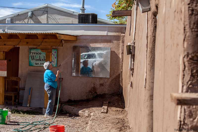 The sixth photo is a panorama of the newly plastered south wall and the east wall, which was the next to be plastered. The seventh photo shows Mary spraying the new plaster to help keep it from cracking more. While it was cool today, the sun was intense on the south wall, and a cool, dry wind was present most of the day. The eighth and final photo in the mud plastering series shows a volunteer inspecting loose mud around the windows on the east wall before starting to plaster it.
