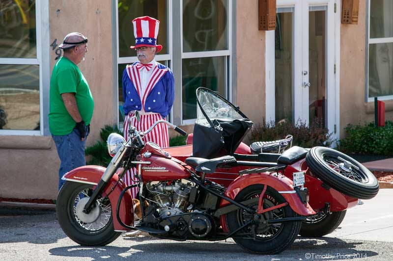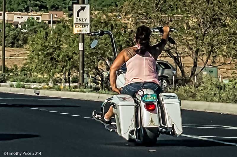 As there is a lot of chance on the outcome of drive-by photos — my camera focused on the buildings instead of the cyclist eating a breakfast burrito while peddling into oncoming traffic on 2nd Street. He was a good rider — he held a straight line as he peddled along with no hands. He seemed to be an interesting character and fashion statement, as well, with his dreadlocks coiled up on top of his head, full beard, bandana around is neck tucked into a dark hoodie, messenger bag, dirty kakis, and cool shades.