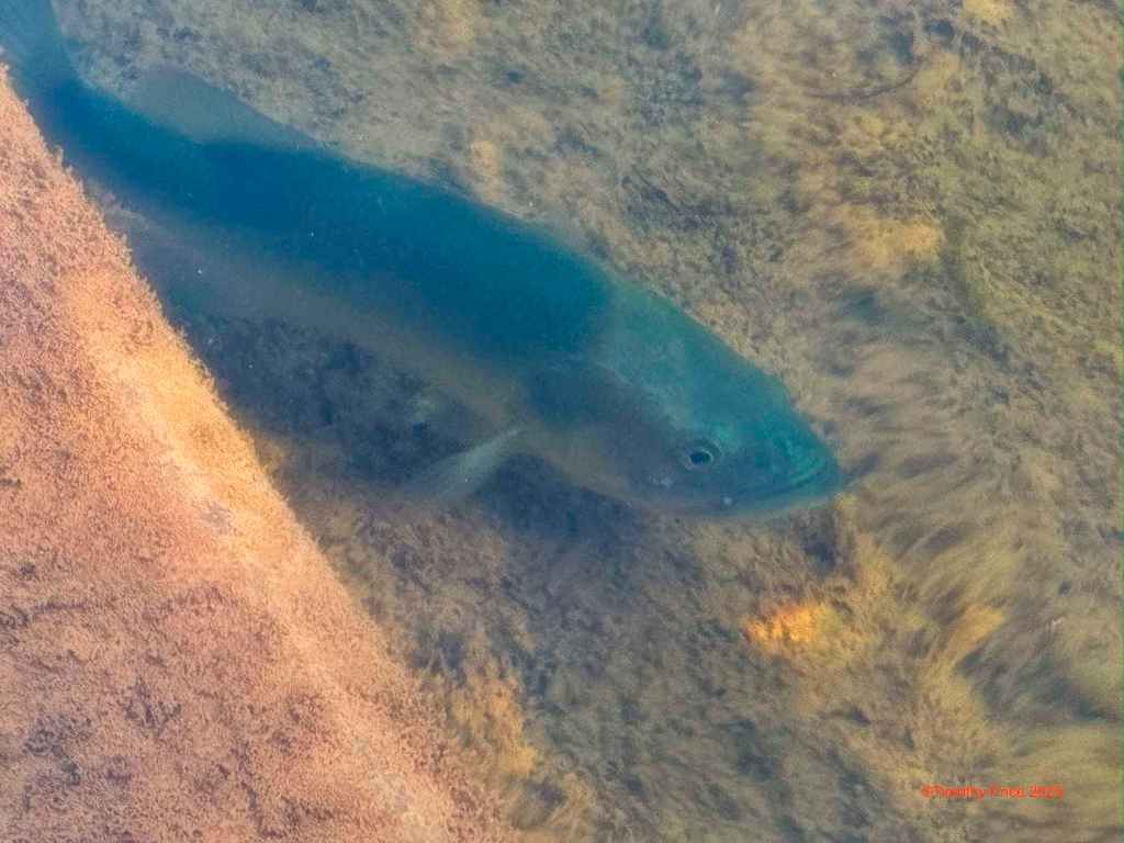 A big blue fish treading water wants to bite on your fingers, but you want to take it with you and throw it on the grill…
