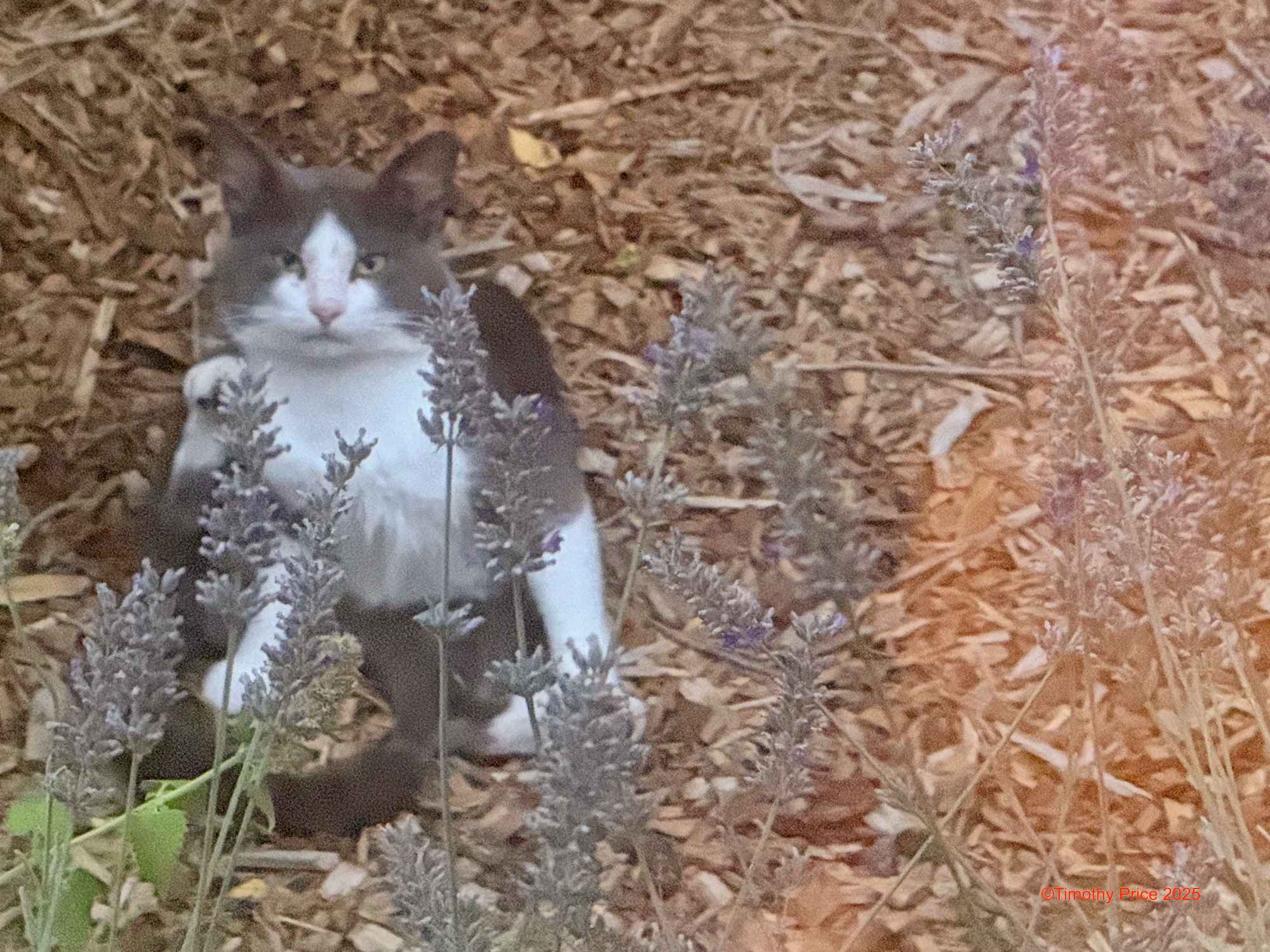 This kitty has been hanging around, fighting with our cats through the wire in the catio, for quite a while. The first time I saw this kitty several months ago, I was awakened by him fighting with Silver at 2:00 a.m. I stumbled out into the catio to see what was going on. I looked up to see this kitty looking down at me through the wire at the top of the catio. Seeing it in the darkness when I was half awake, it really looked like Spunk. I said, “Spunk! How did you get outside?” The kitty simply stared at me. I went back inside to put on shoes so I could go outside and collect Spunk, but there Spunk was on the bed.