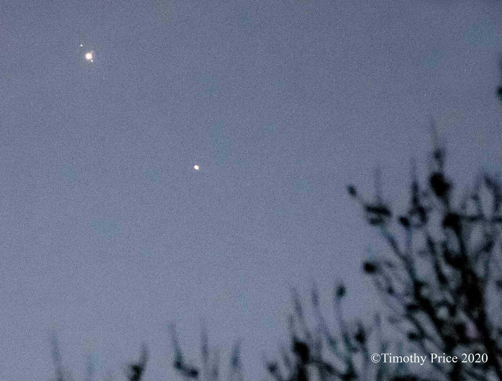 Jupiter, a few of Jupiter’s moons and Saturn on the lower right. December 27, 2020.