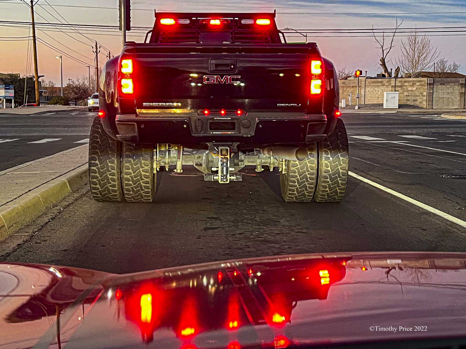 I left the office late this evening, so I had to do a drive-by of the clouds and contrails at sunset. While I was sitting behind a dually at the light, I noticed the Devil staring at me through the tailgate. He was using the holes my headlights made reflecting in the tailgate to see what was going on. Satin is a shifty little devil when it comes to shapes and reflections.
