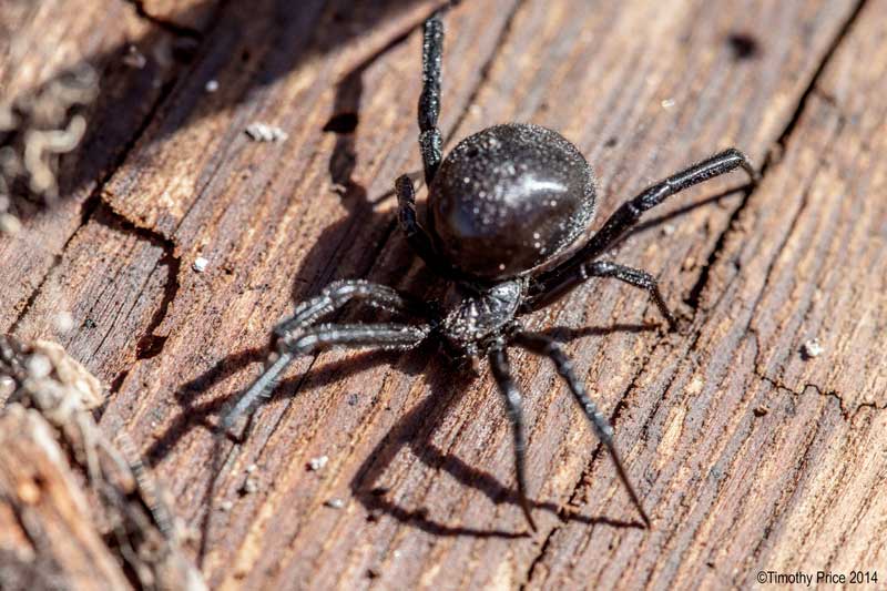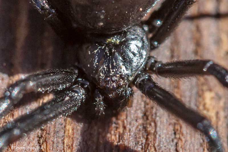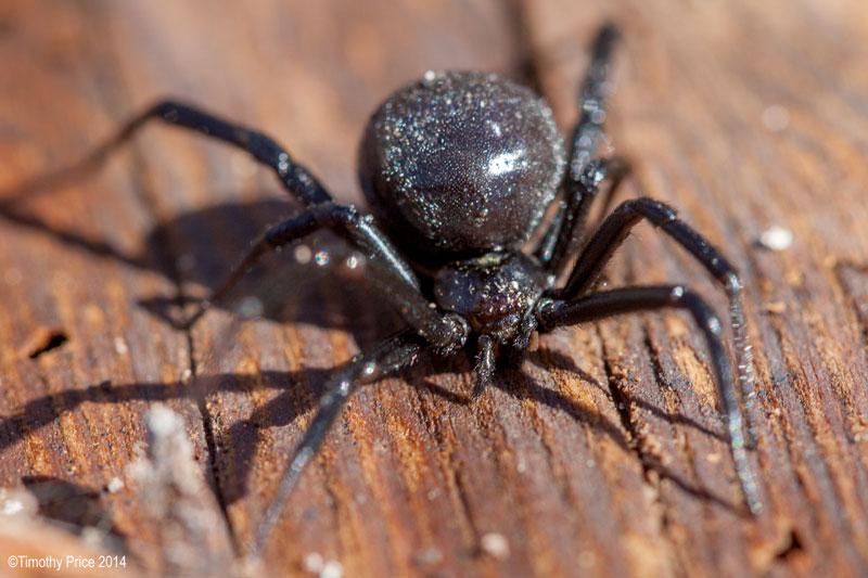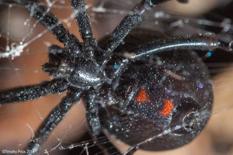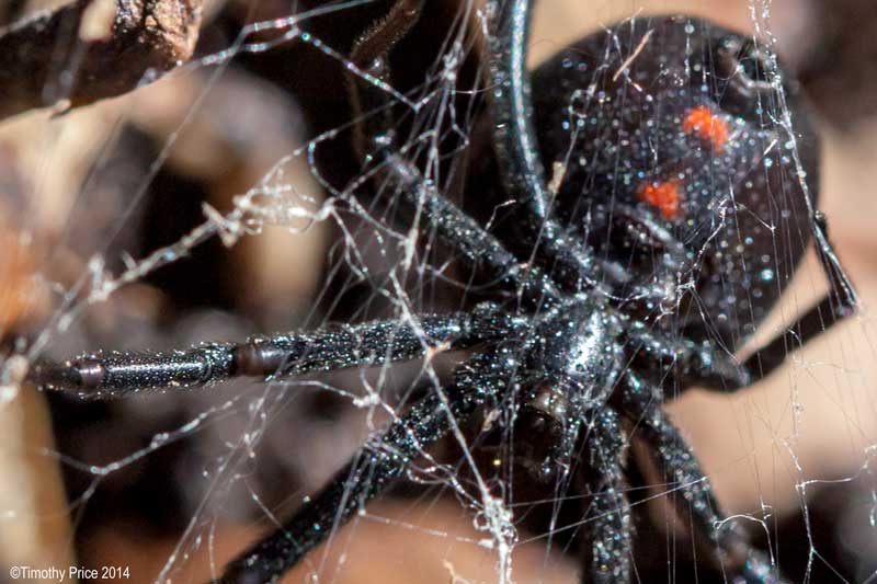 While I was working on the gray water system this afternoon, I found a black widow where they like to be — in wet, humid areas — like the underside of the cover for the distribution hub for the gray water system. She seemed a little stunned by her sudden exposure to the sunlight, and allowed me to do several photos of her underside from different angles; but then I got too close and she scampered under some of the mulch. While I was cleaning out the pipes, she ran out on the cover to dry herself after I apparently got her wet. She allowed me to do several macro shots from a top view while she was drying out; therefore, the series gives you a detailed look at Vincent’s prize “The Black Widow”.