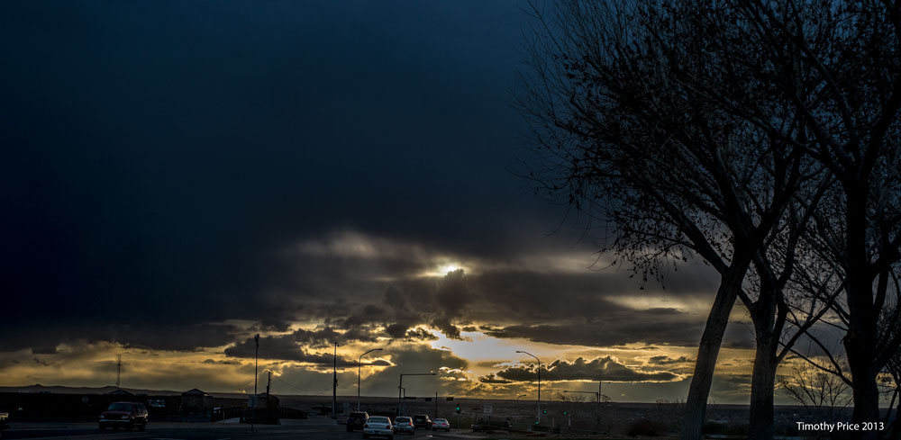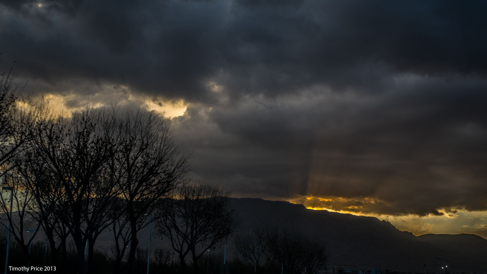 We got a lot of wind and dust on Monday, and sporadic rain, wind, snow, and hail yesterday, making the light really strange at sunrise and sunset. I think some places in the metro area might of got measurable precipitation, but it didn’t register on our rain gage. “¡Cuatro gotas!” (not much rain) as the Spaniards would say — just enough to leave muddy rain drops all over our cars.