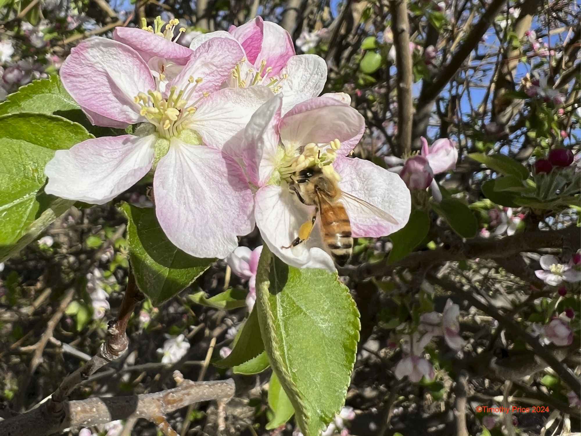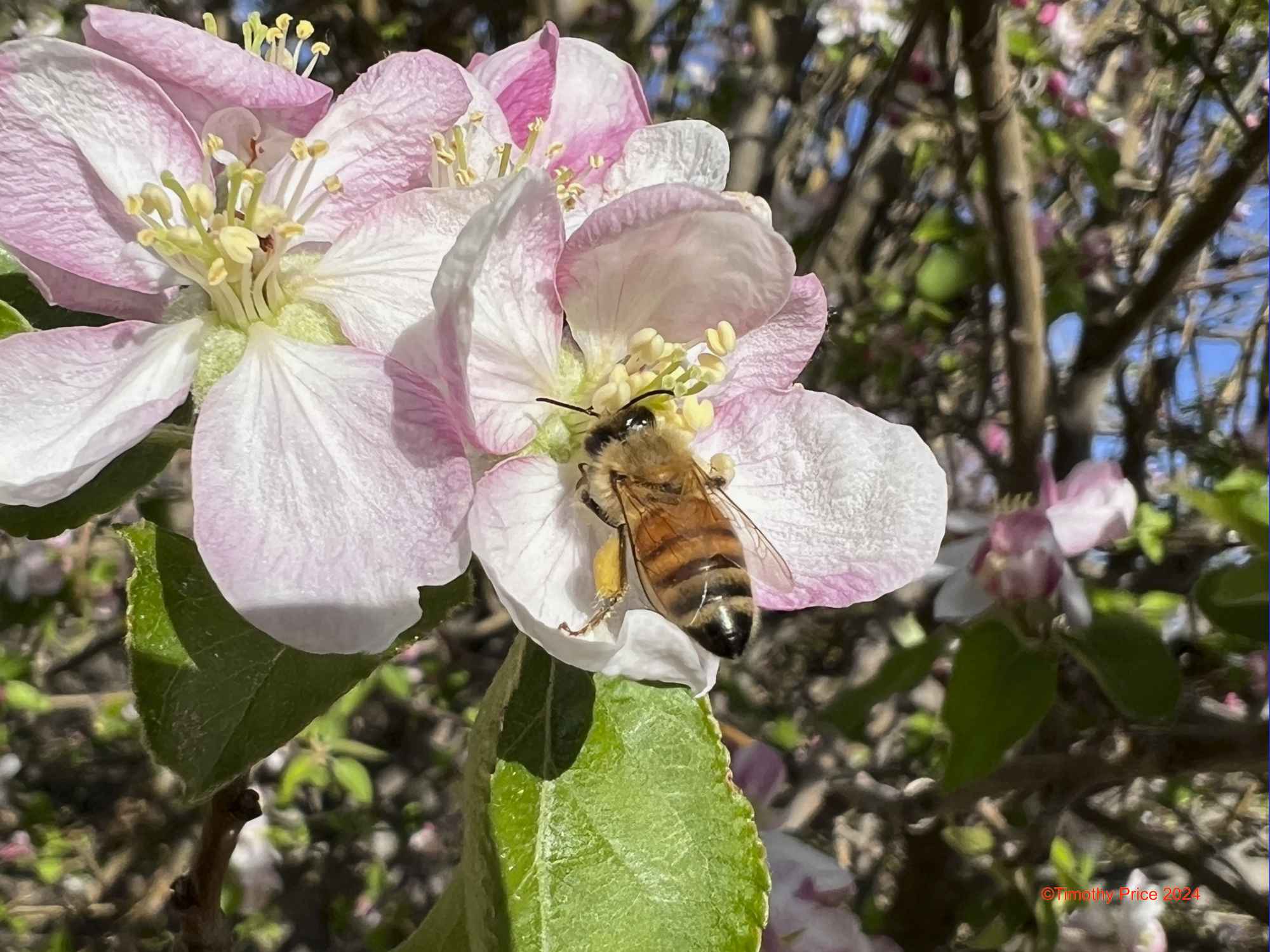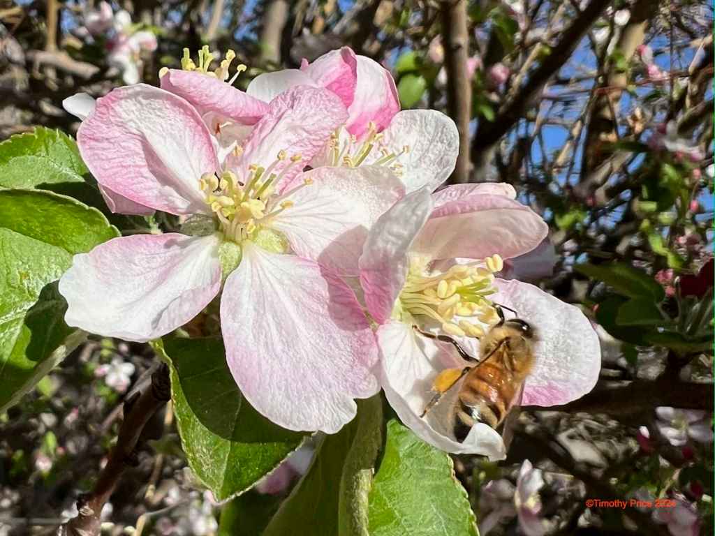 Beeing Aligned April 12, 2024 Timothy Price31 Comments Alignment of the moon and the Pleiades on the right side of the photo. A honey bee was working the apple blossoms.