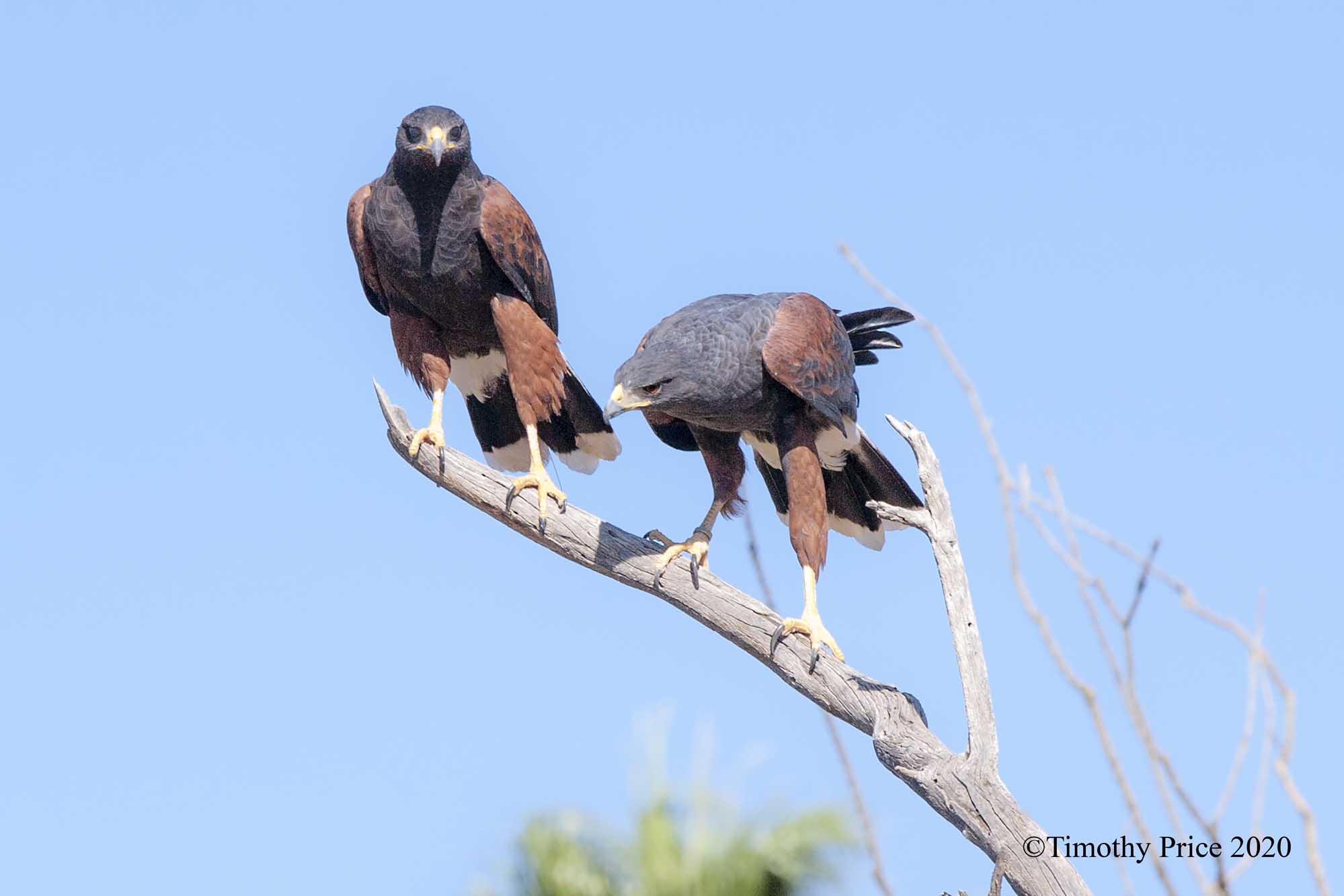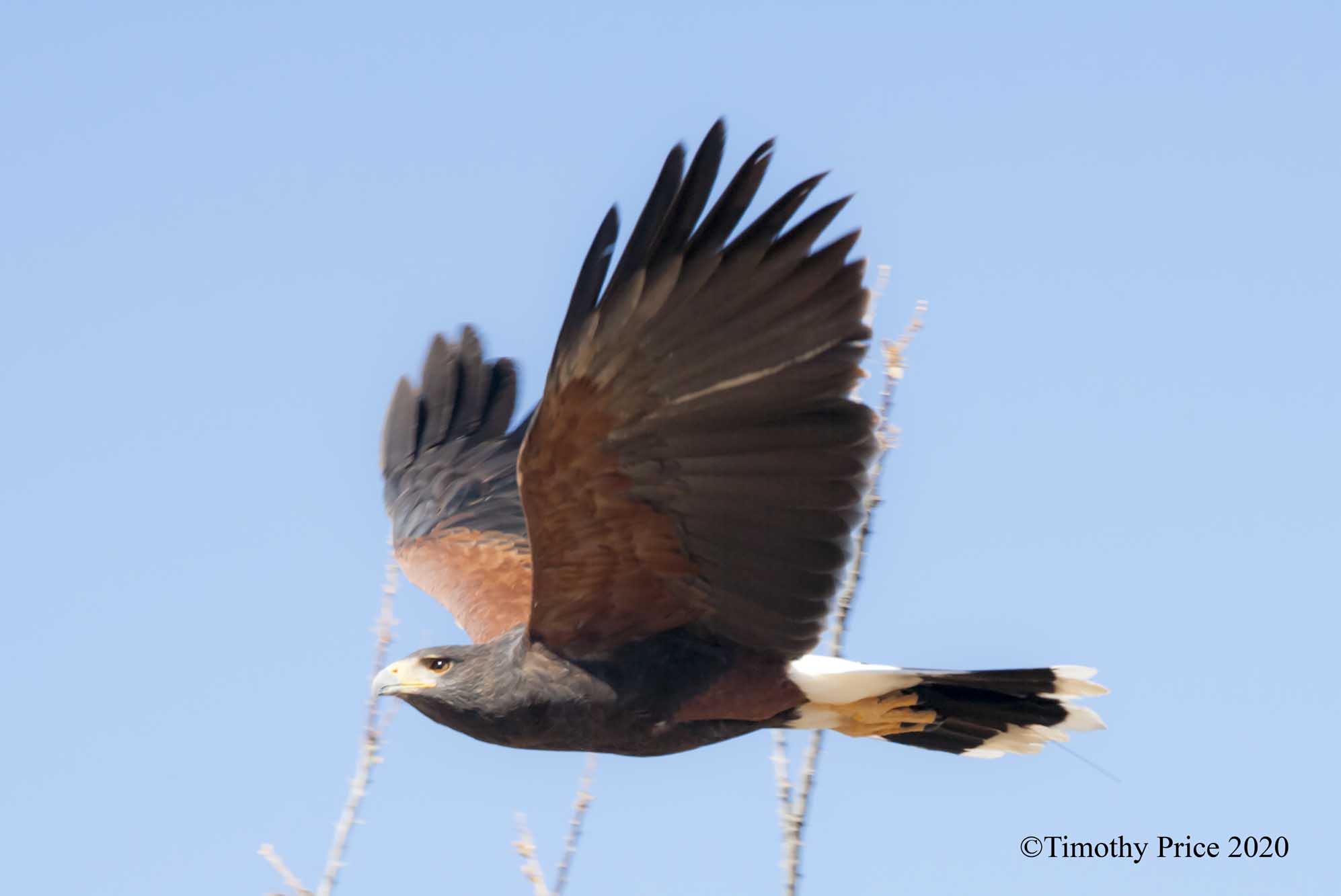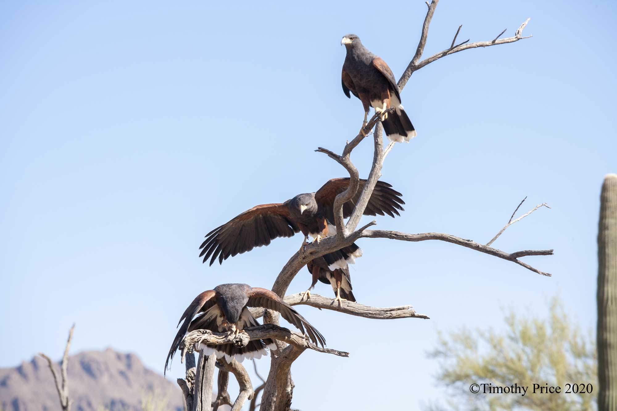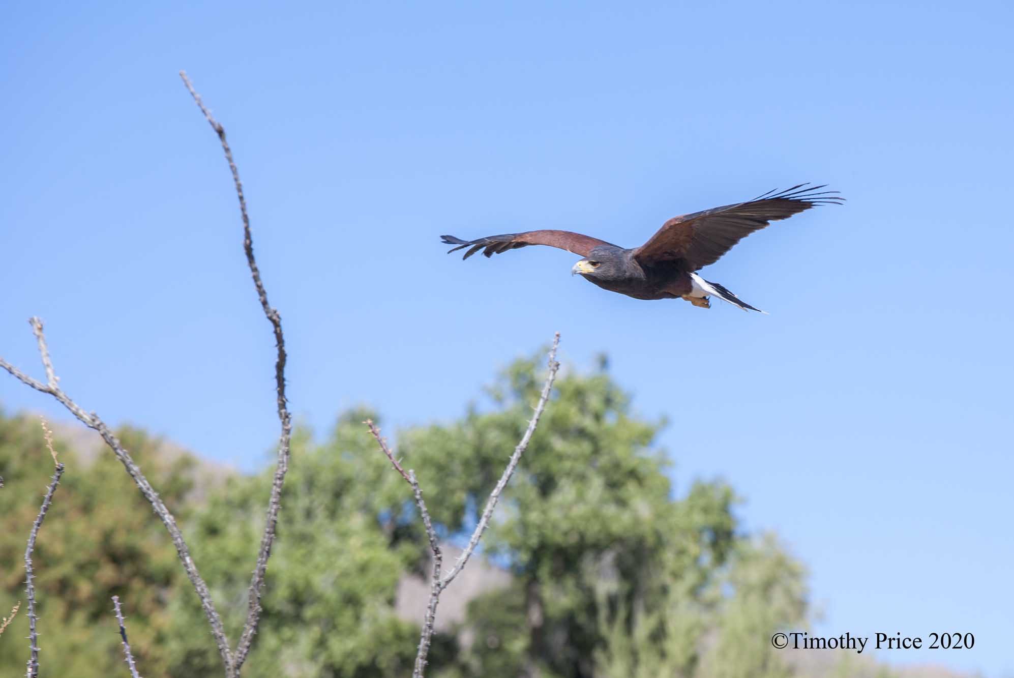 The stars of the show we experienced were the Harris Hawks. Four Harris Hawks performed for the finale of the free-flight show. Harris Hawks have made a regional adaptation to the harsh conditions in the Sonoran Desert by hunting in groups. The Sonoran Desert is the only place that Harris Hawks have been observed hunting and working together in groups. Their distribution in the US is limited to southern Arizona, southeastern New Mexico, and southwest Texas. Their larger distribution is throughout most of Mexico, the west coast of Central America, and the lower elevations of South America. Free flight shows are great for photographing these raptors because they are close enough to get a lot of detail and action shots.