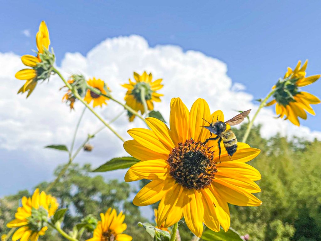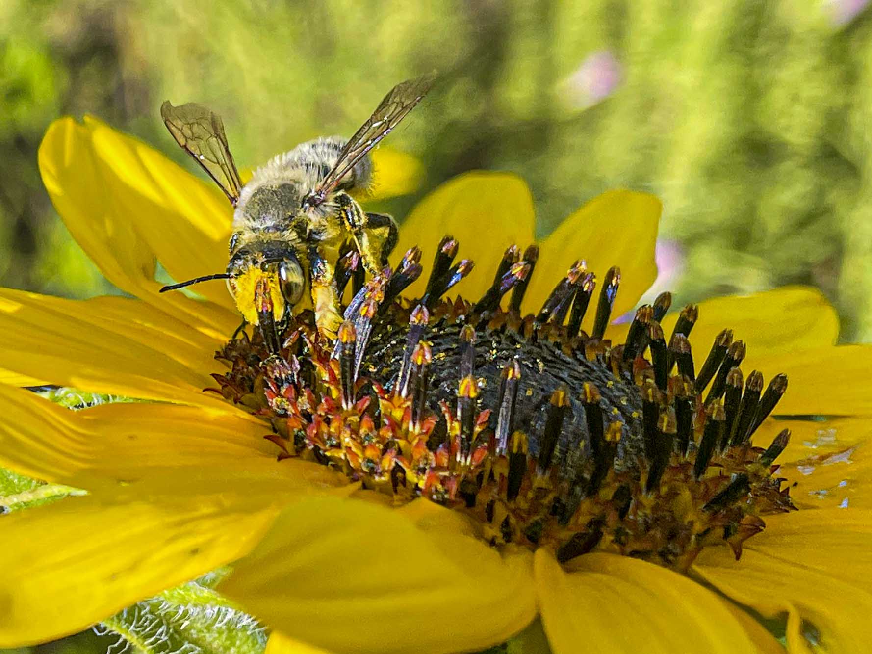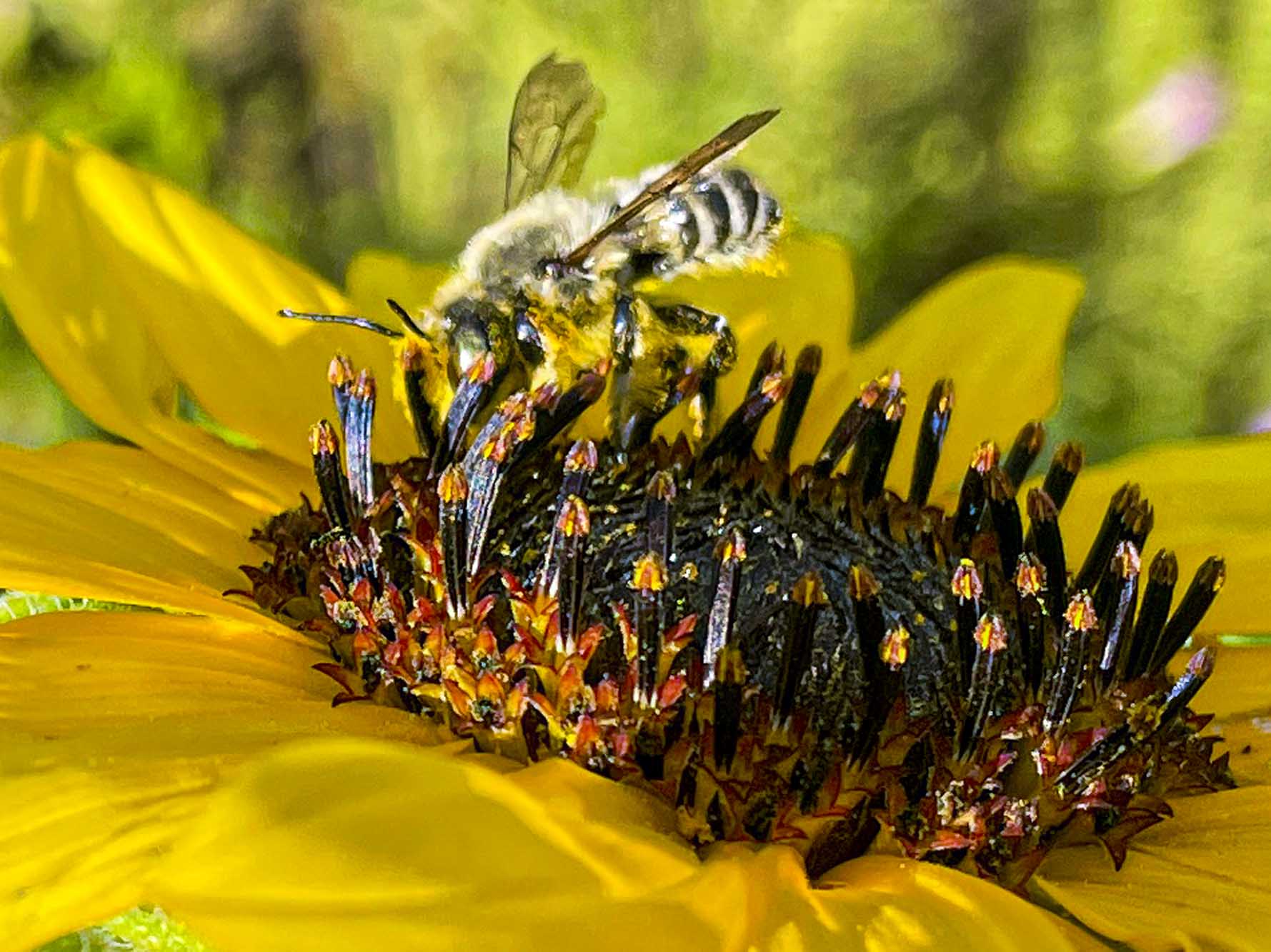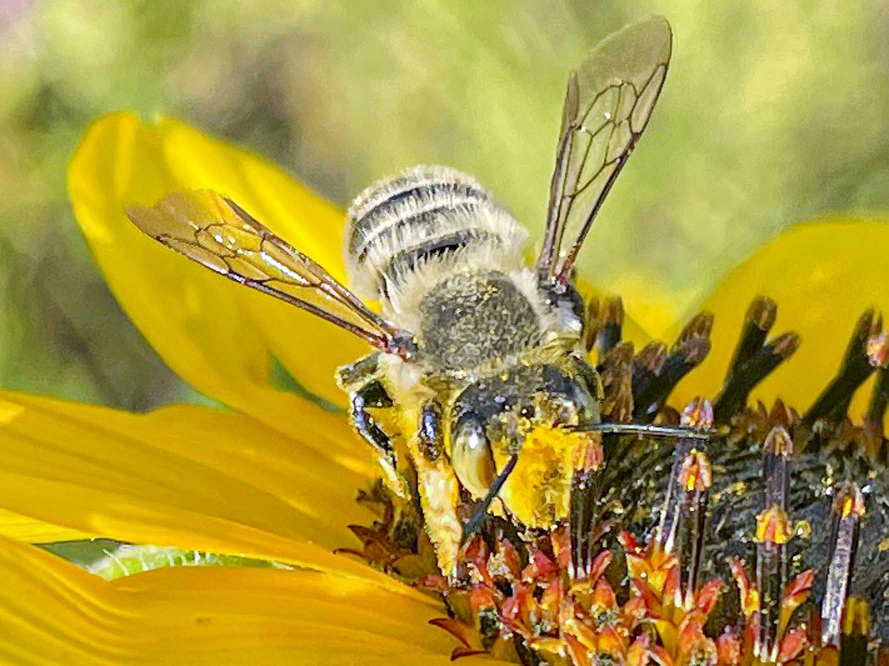 This native bee was working the Shasta Daisies. The insects really love the Shasta Daisies while they are in bloom.
