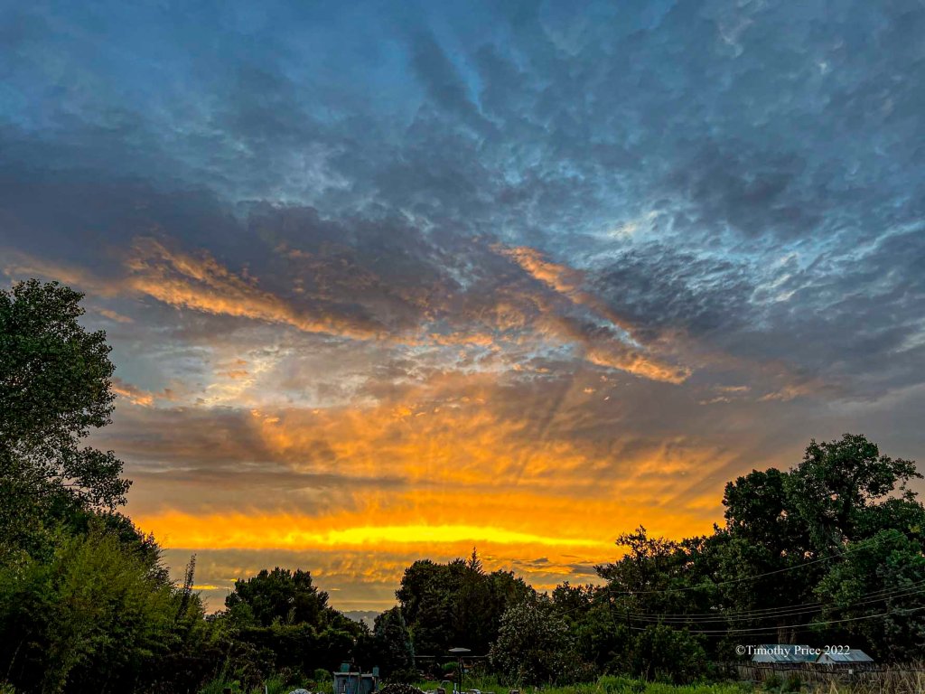 Pre-sunset at around 8:00 pm looking southeast. Resa’s tree lighted on the left, Dale’s Peach tree in front (it has peaches), and Rebecca’s Black Bamboo patch with yellow tops in the middle right background.