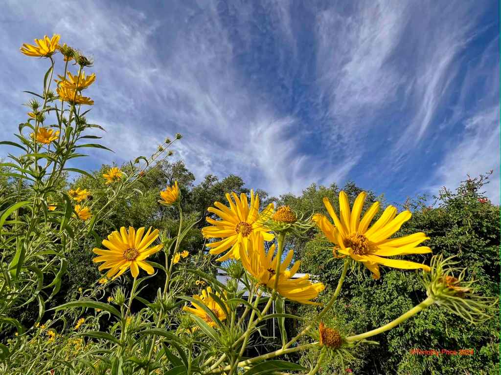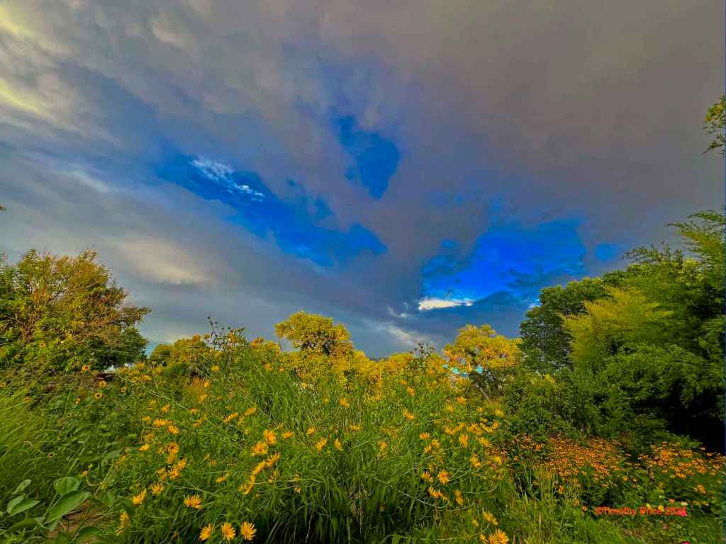 It started raining while Jake and I were on our walk. A bright rainbow came out of Shey’s tree.