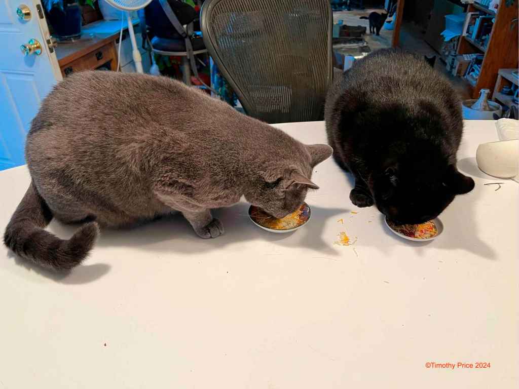 When Glenda eats cheese, she licks as much out or more of the dish as she eats. I put the dish I use to cover the cheese in front of Glenda to catch her mess and put it back into the bowl when she’s done. Loki figured out he could eat Glenda’s spillover instead of butting in on Marble’s cheese. When Marble was finished, Silver joined Loki.