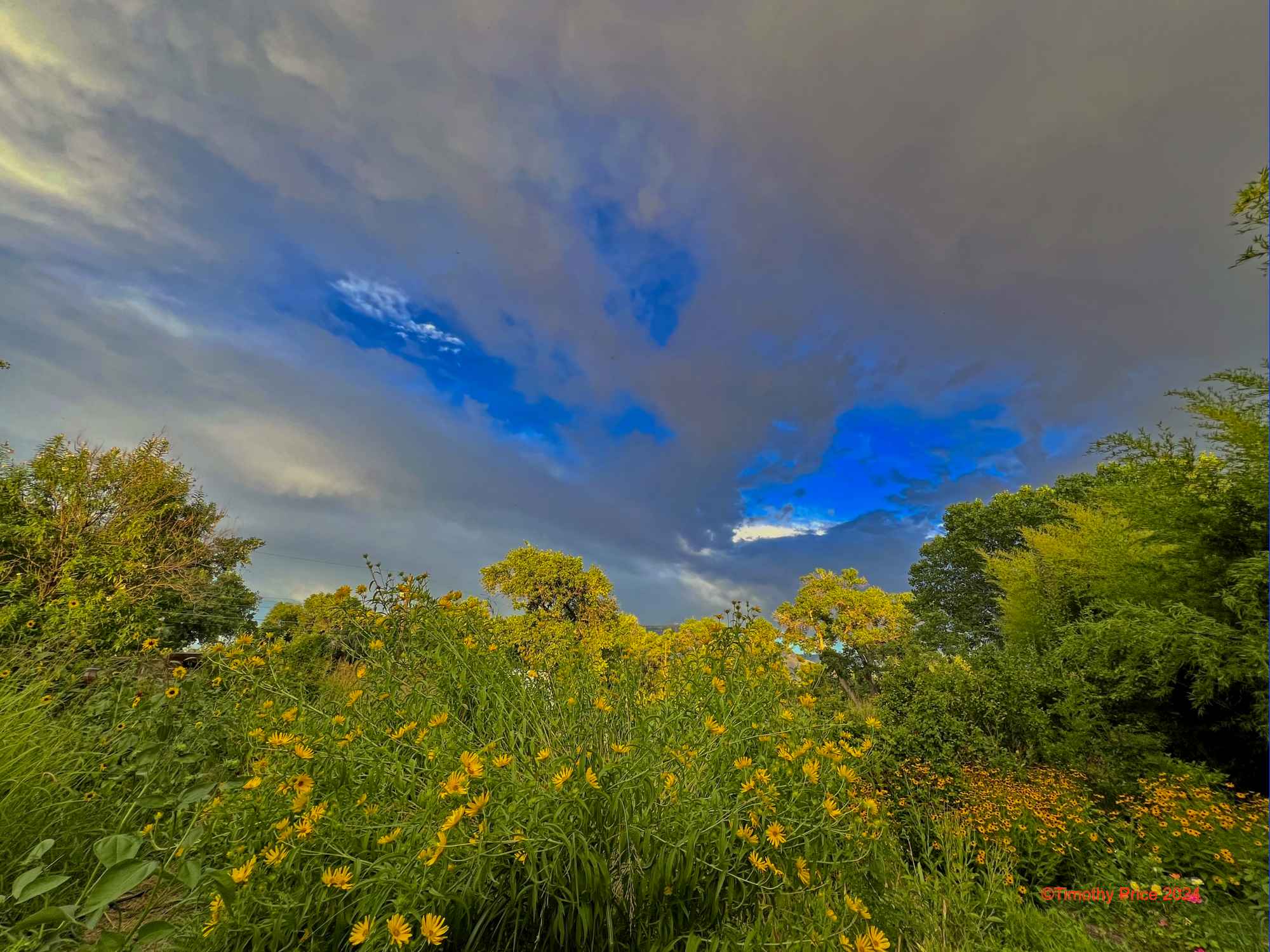 It started raining while Jake and I were on our walk. A bright rainbow came out of Shey’s tree.