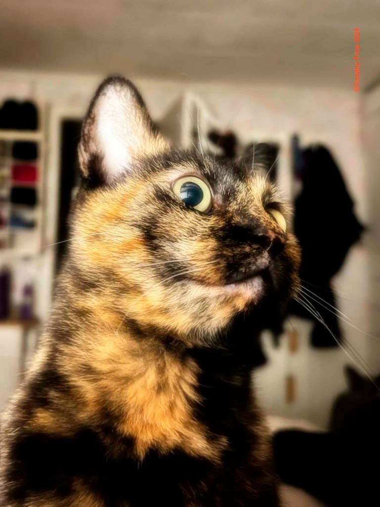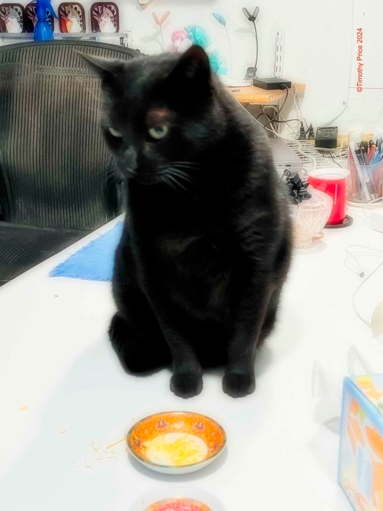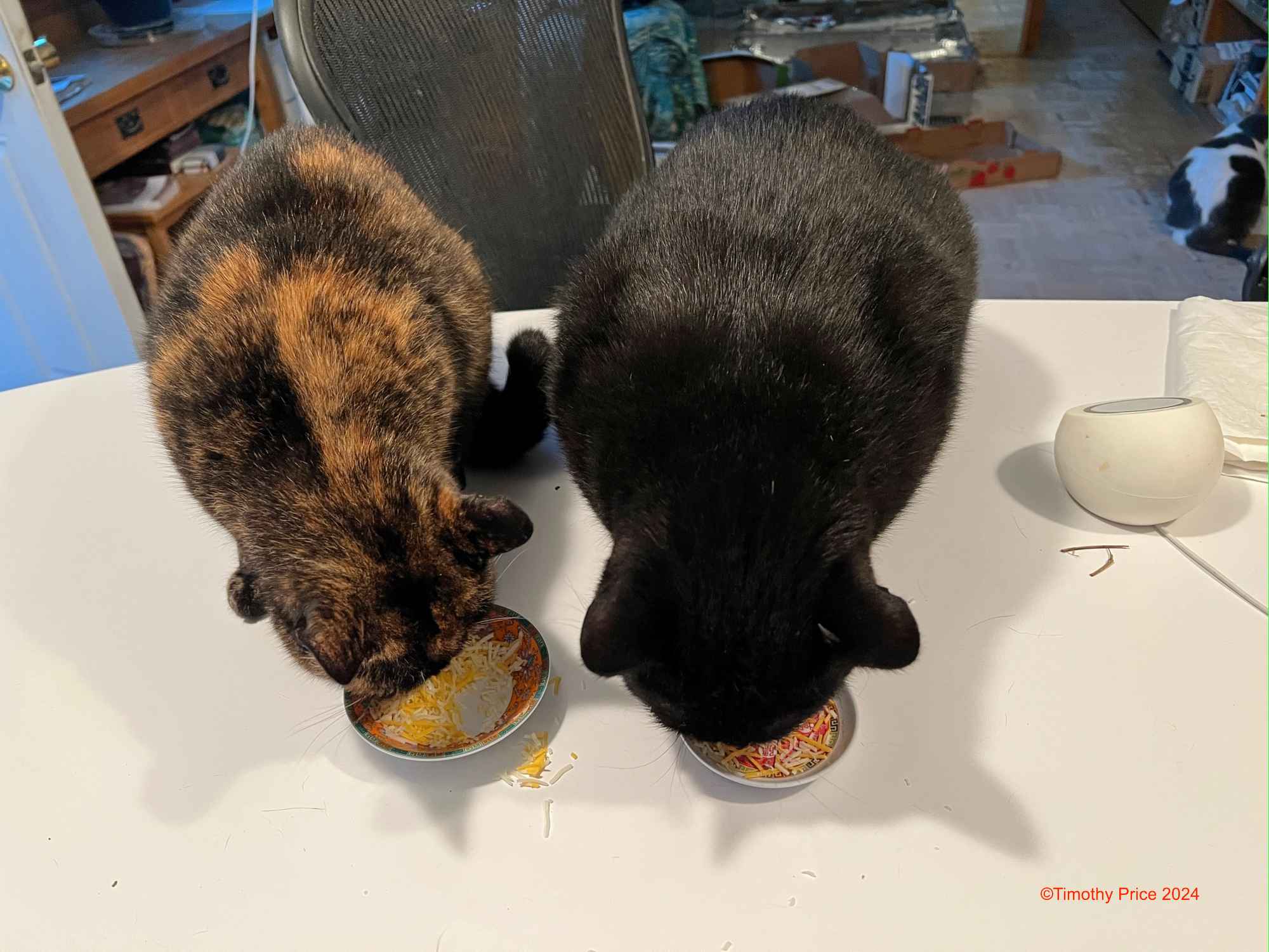 When Glenda eats cheese, she licks as much out or more of the dish as she eats. I put the dish I use to cover the cheese in front of Glenda to catch her mess and put it back into the bowl when she’s done. Loki figured out he could eat Glenda’s spillover instead of butting in on Marble’s cheese. When Marble was finished, Silver joined Loki.