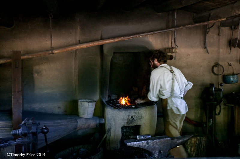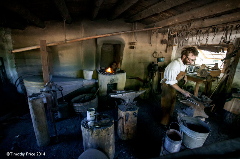 The Blacksmith at las Golondrinas pumps a giant bellows to stoke the fire. The blacksmithing process involves a lot of back and forth between the tools, the bellows and working the hot iron for it cools and goes back into the fire.