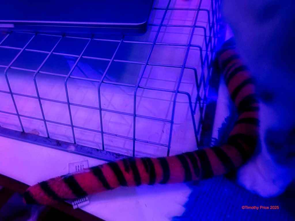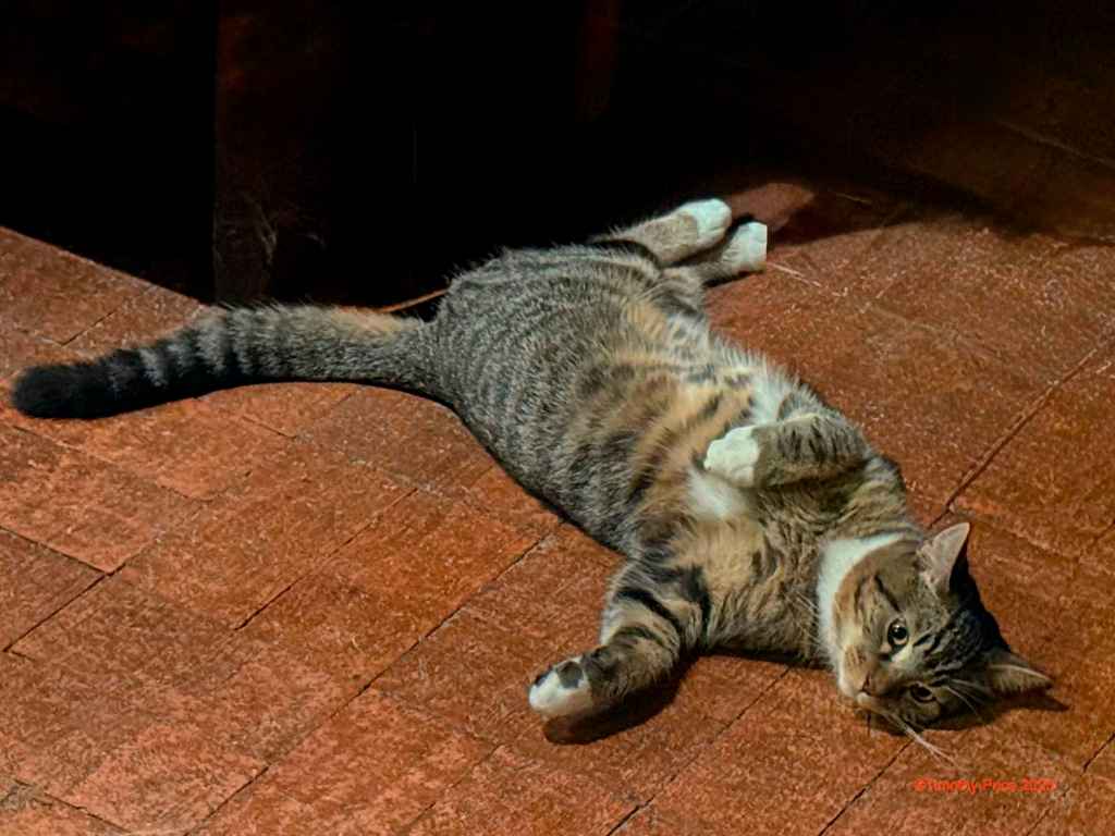Tycho Kitty is lying on the floor, contemplating Jake.