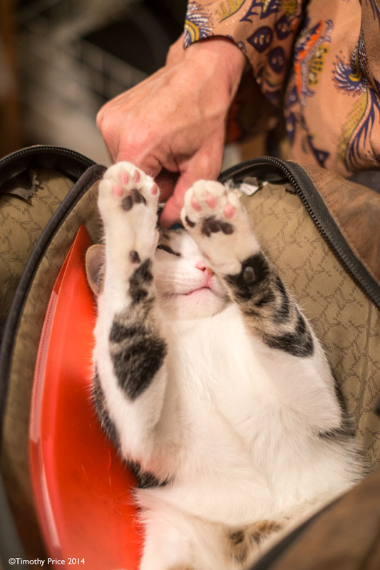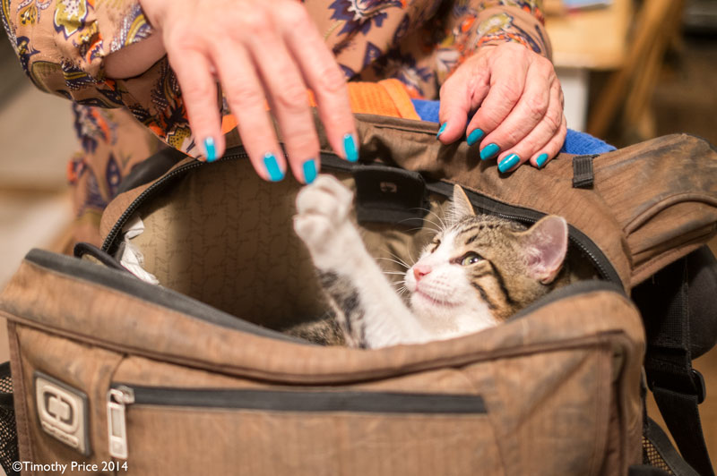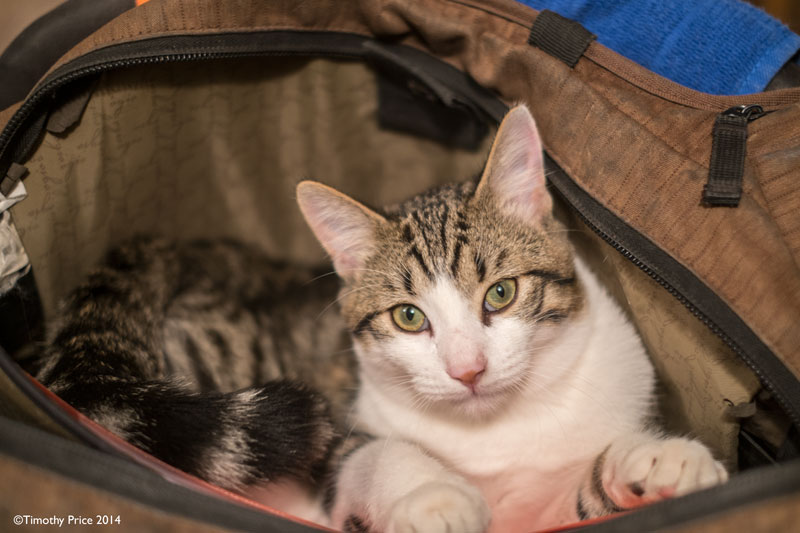 Cat in the Bag October 16, 2014 Timothy Price23 Comments No sooner had Laurie put her bag on the chair than Spunk was in it trying to bank up some modeling cash. He put on quite a show, and once he figured he was in the black, he started chewing on the bag.