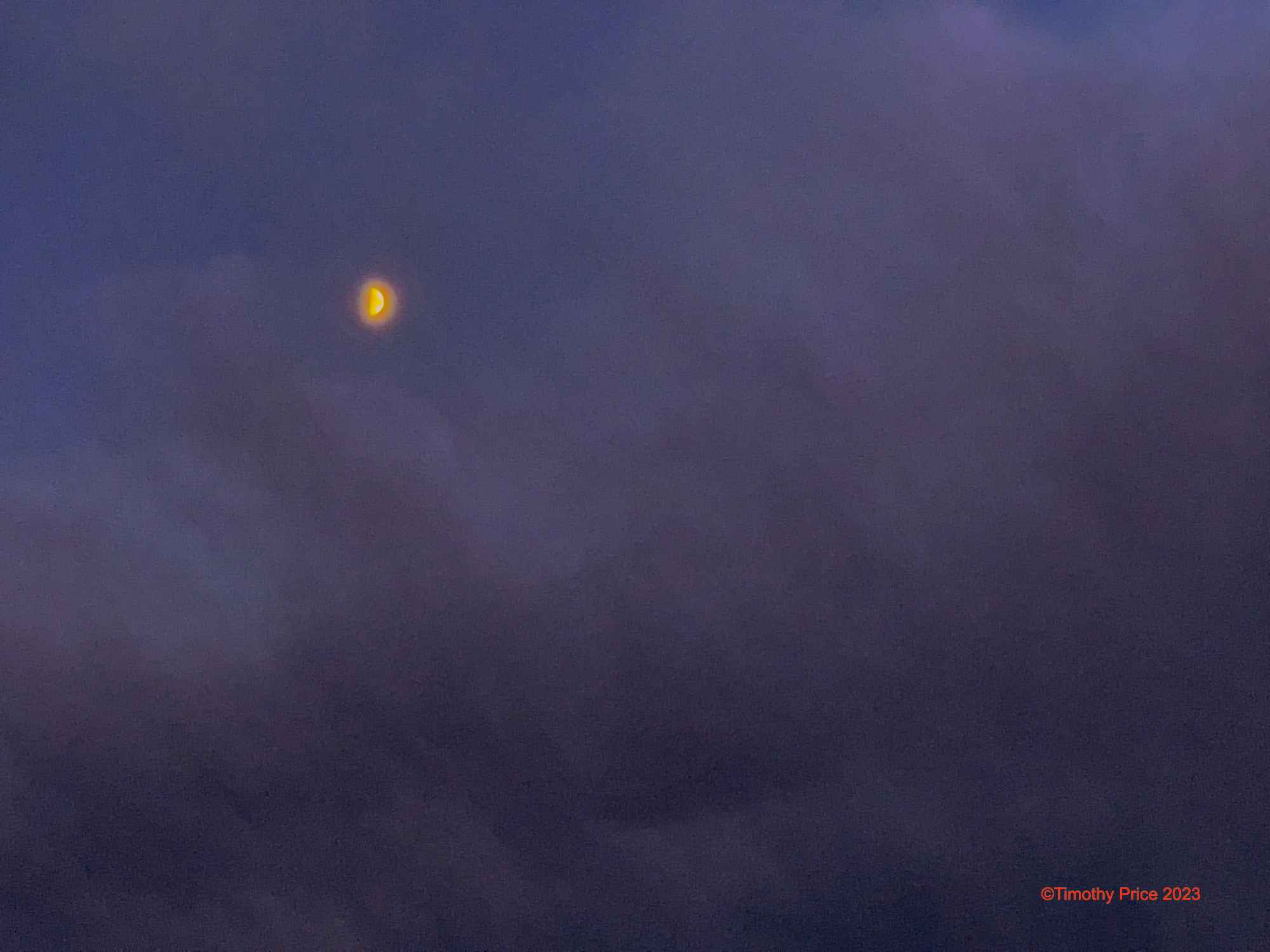 As darkness fell, the moon showed through the clouds.
