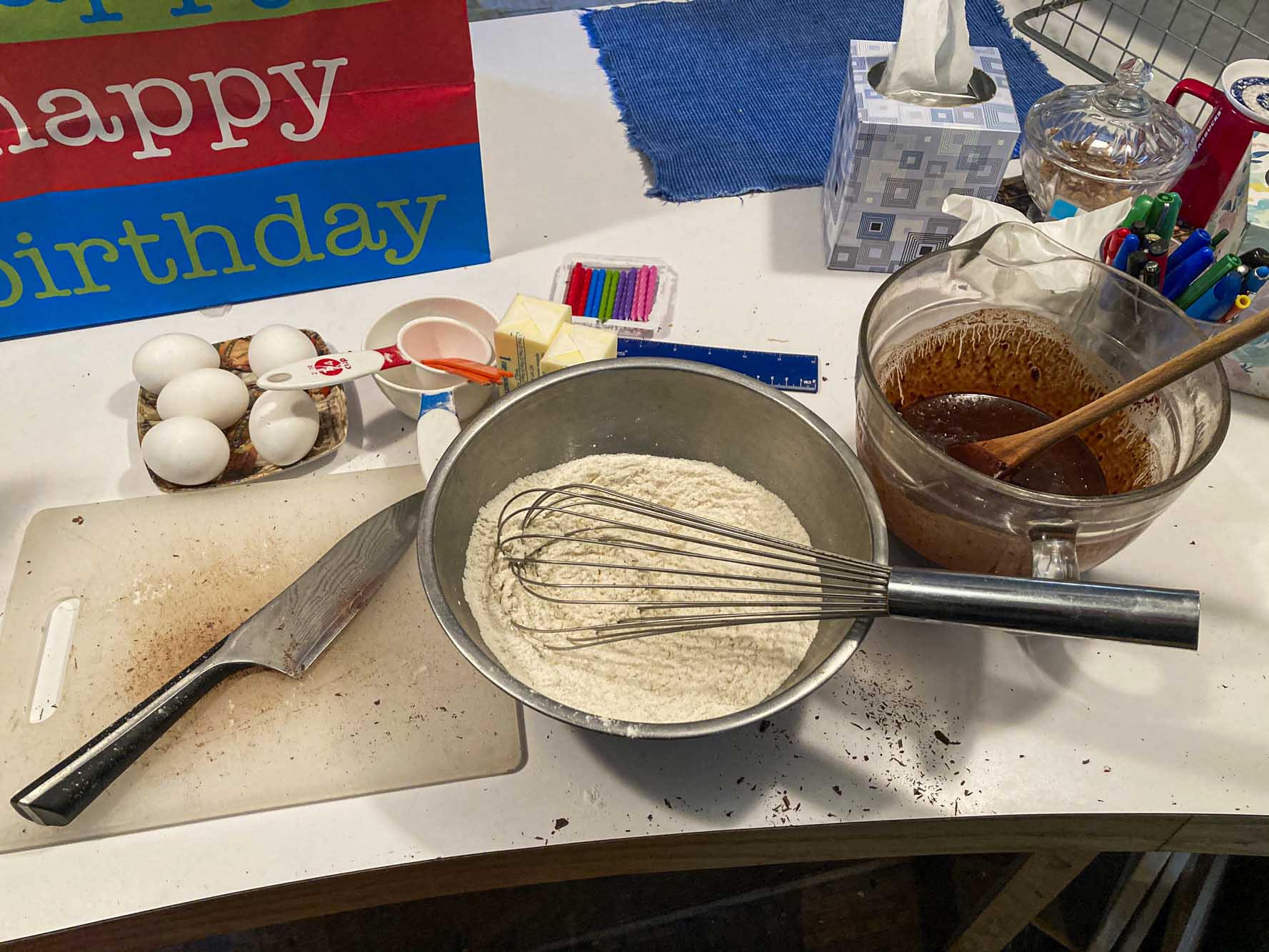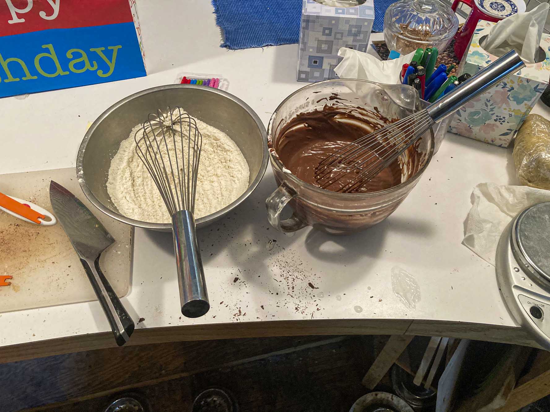 I prepped the flour while the chocolate mixture cooled so I could add sour cream to it.