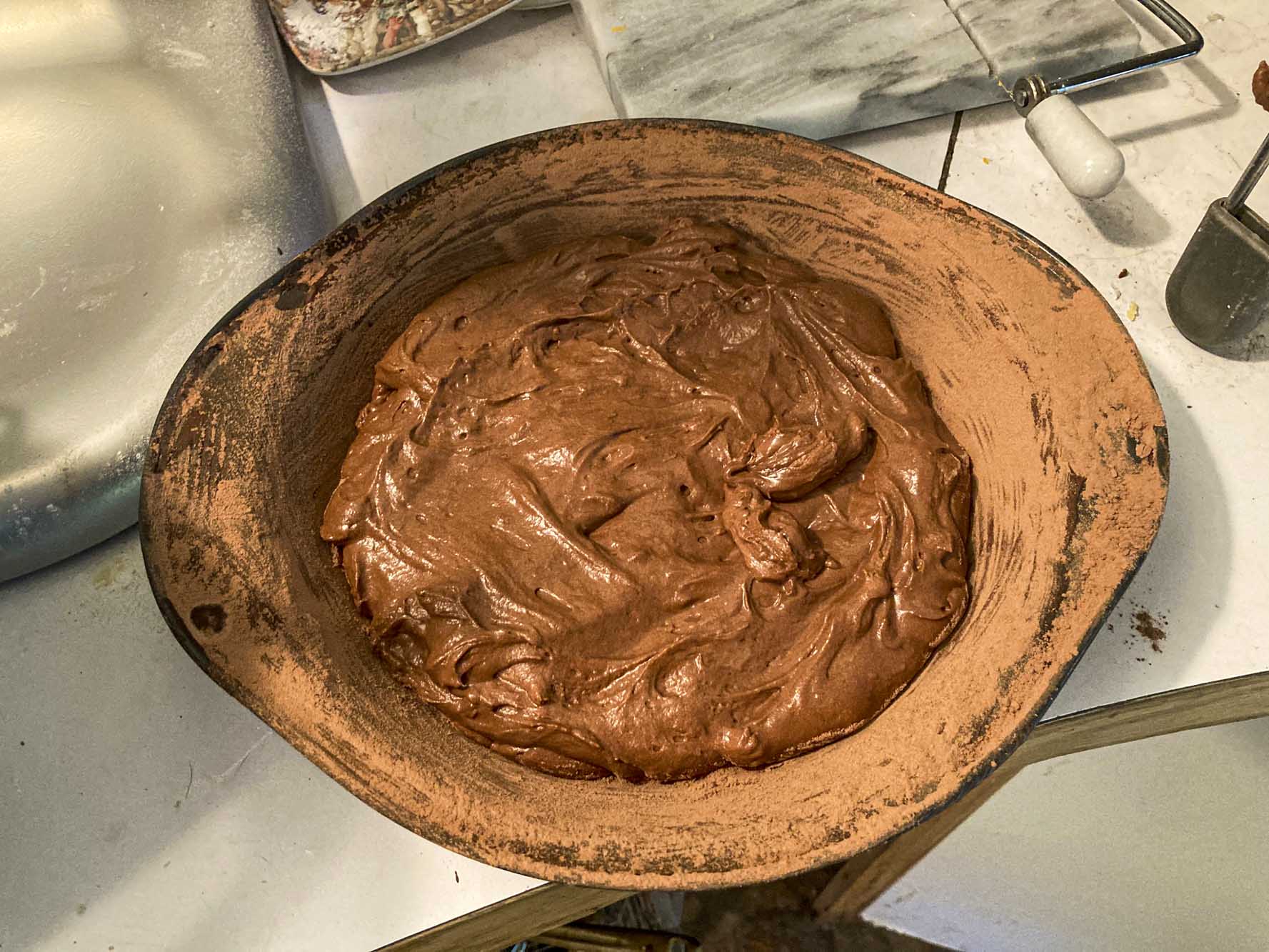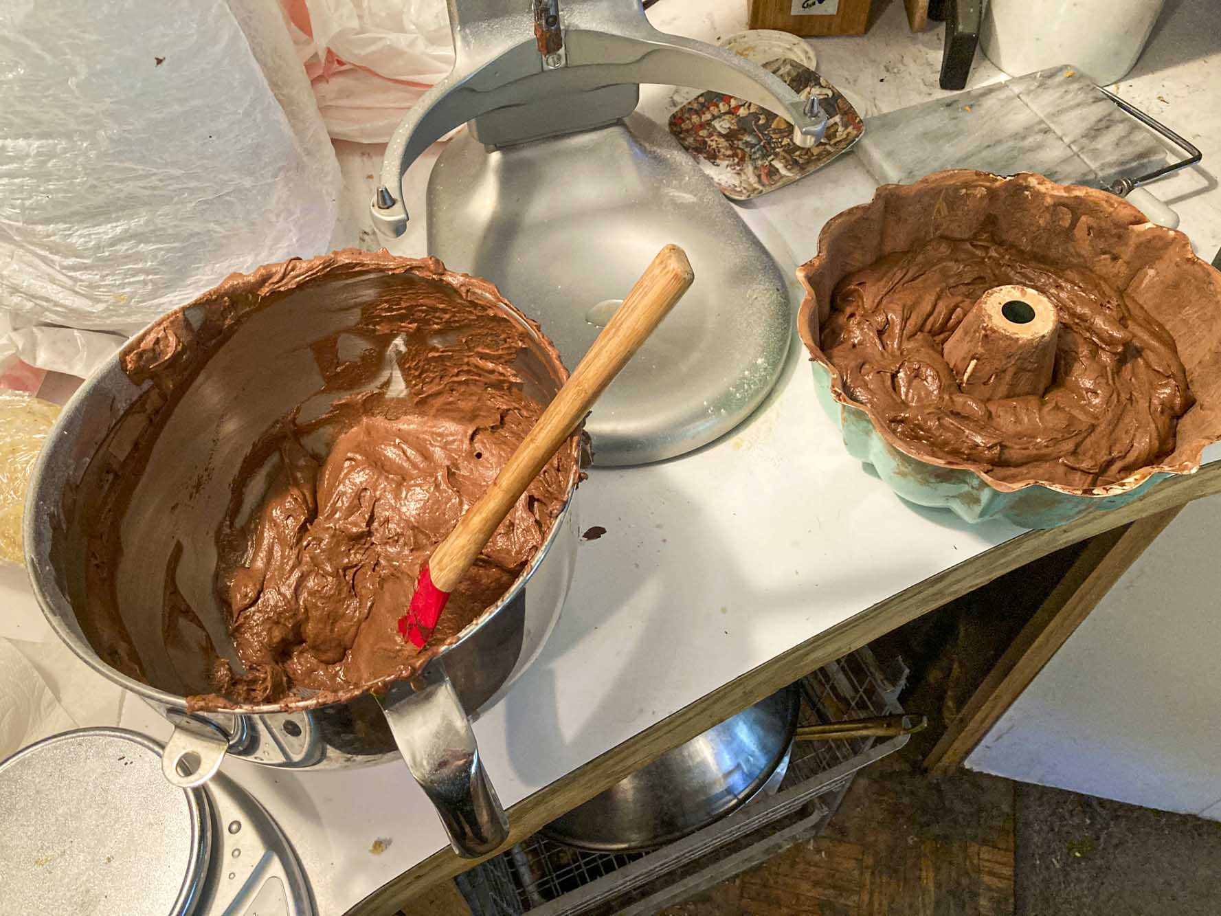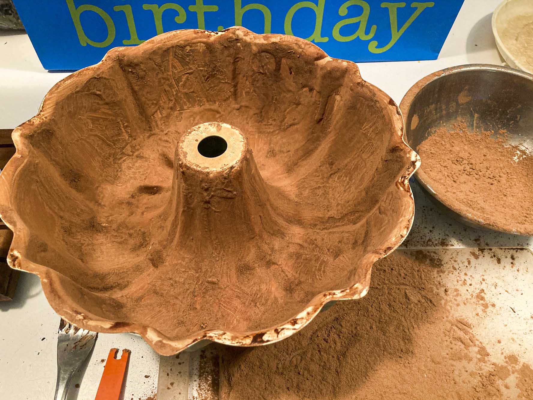 The recipe has you make a chocolate butter past to grease the bunt pan and then coat the pan with cocoa powder. Laurie said it worked better to use a mixture of cocoa powder and flour. Either way, I made a mess.