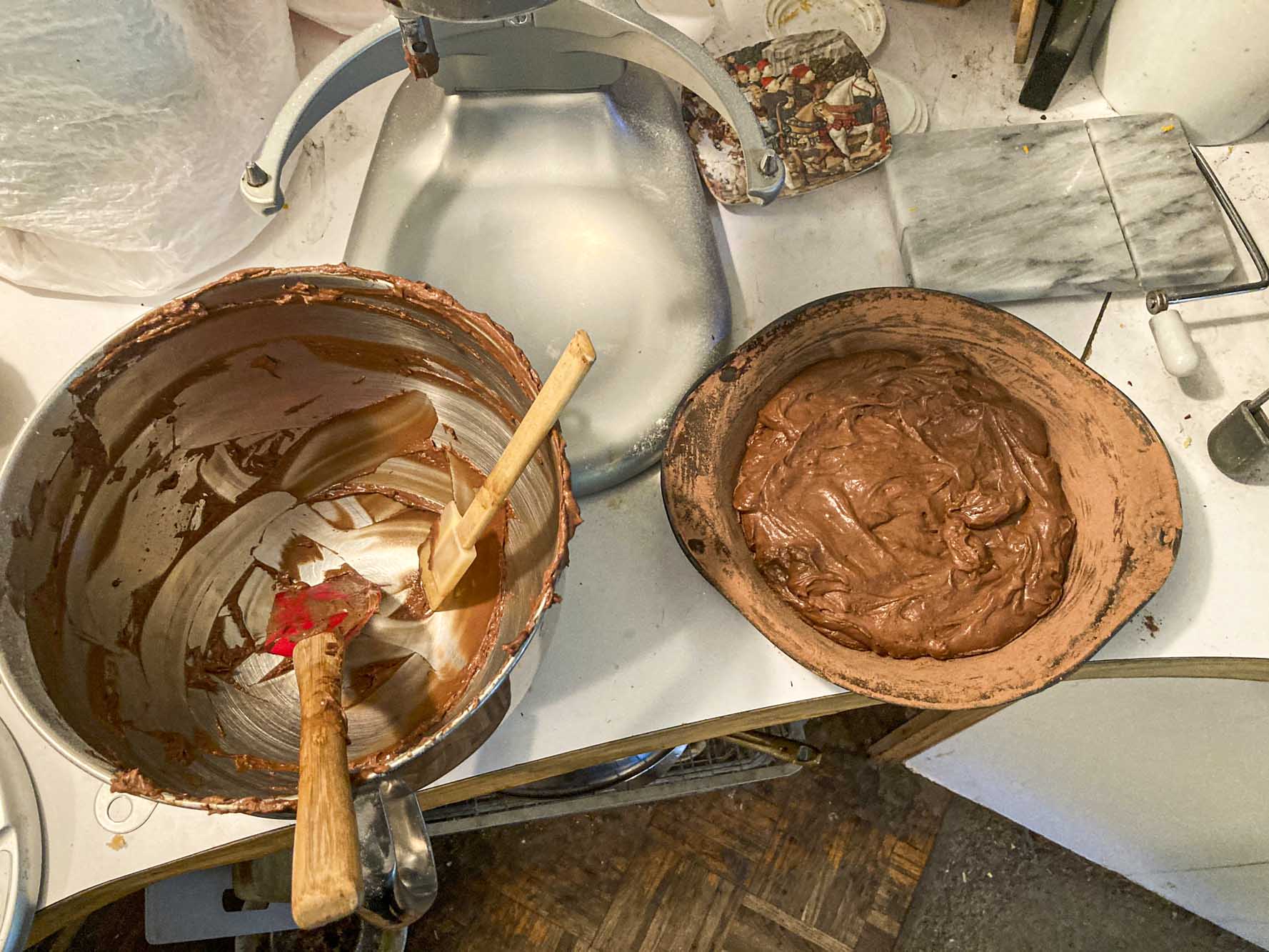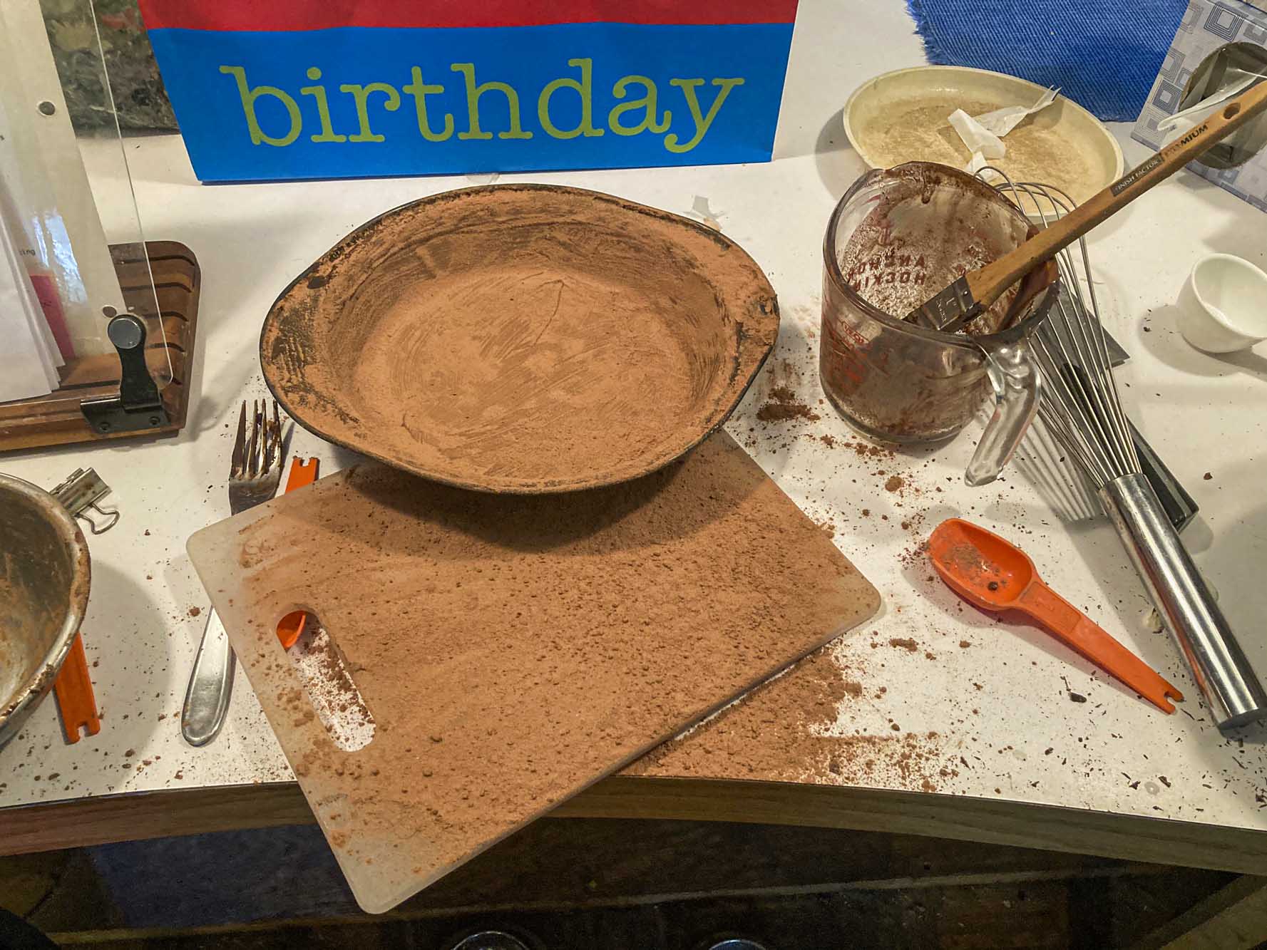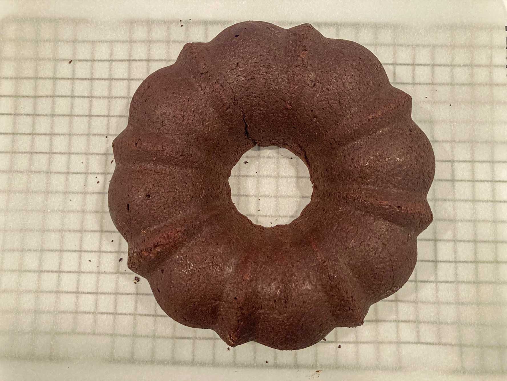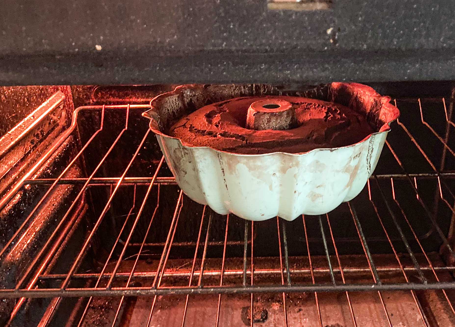 The recipe has you make a chocolate butter past to grease the bunt pan and then coat the pan with cocoa powder. Laurie said it worked better to use a mixture of cocoa powder and flour. Either way, I made a mess.