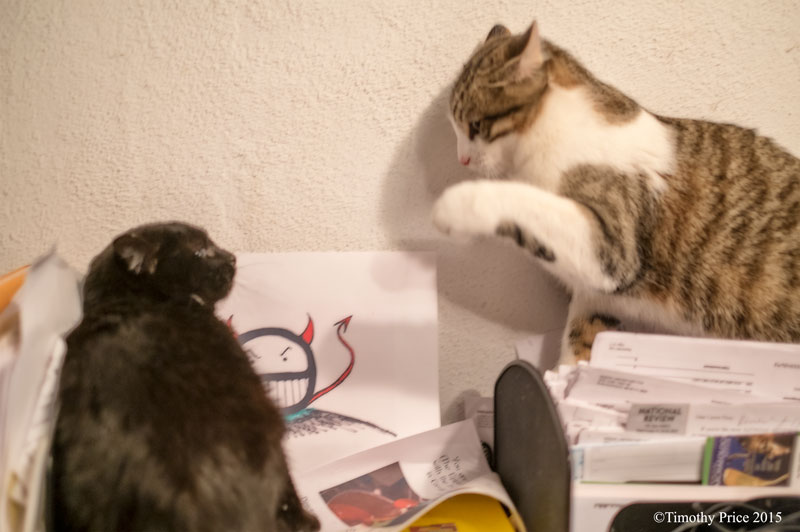 After helping me change the sheets on the bed, Diné started challenging Rosencrantz by biting him on the legs. I ran and got my camera, and when I returned Rosencrantz was giving Diné “mad dogs”, and the fight was on. Diné is the one who picks fights with Rosencrantz and Guildenstern and she is always on top as the aggressor, because even though Rosencrantz and Guildenstern are both much larger and stronger than Diné, she is still top cat; therefore, they always maintain the defensive position when she attacks. Even though Rosencrantz brandishes his impressive set of claws in Diné’s face (those claws have earned him the nick name “Claws and Fangs”), Diné is not impressed and whoops on Rosnecrantz until she feels she’s defeated him. This is the full sequence of their sparring match from mad dogs to Rosencrantz’ attempt to get in one last swat before Diné jumped off the bed after her triumphant, tiger-like pounce.