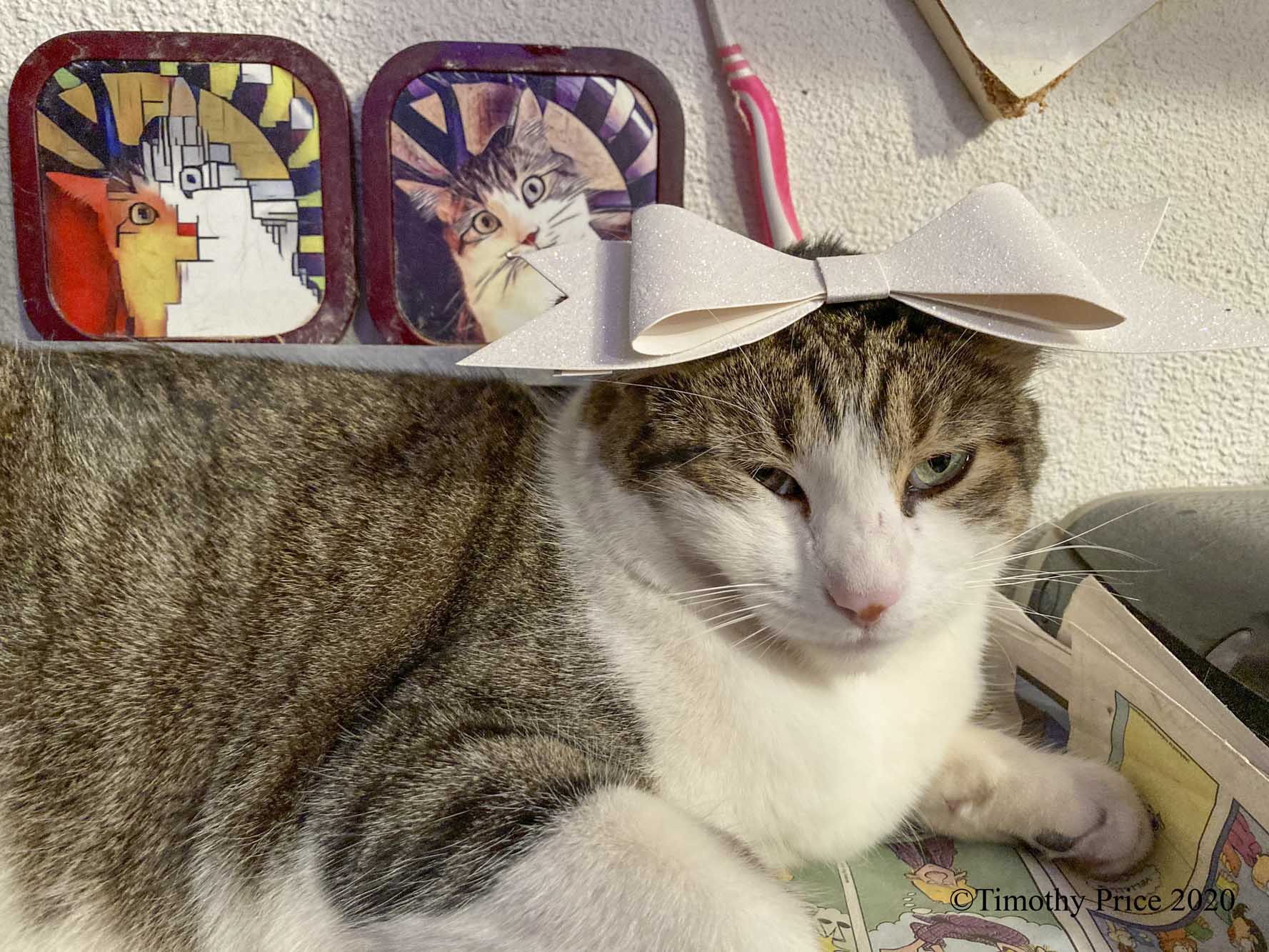 Spunk was not very happy with me putting a cute bow on him making him look adorable. Adorable is not a part of Spunk’s vocabulary as far as he’s concerned. Rough, Tough, and Handsome yes. Cute and Adorable NOoooo! Fortunately, I was able to use the Cat Herder’s secret weapon, catnip, to calm down the poor humiliated Spunk kitty. He forgave me, followed by sweet, or should I say “catly”, kitty dreams.