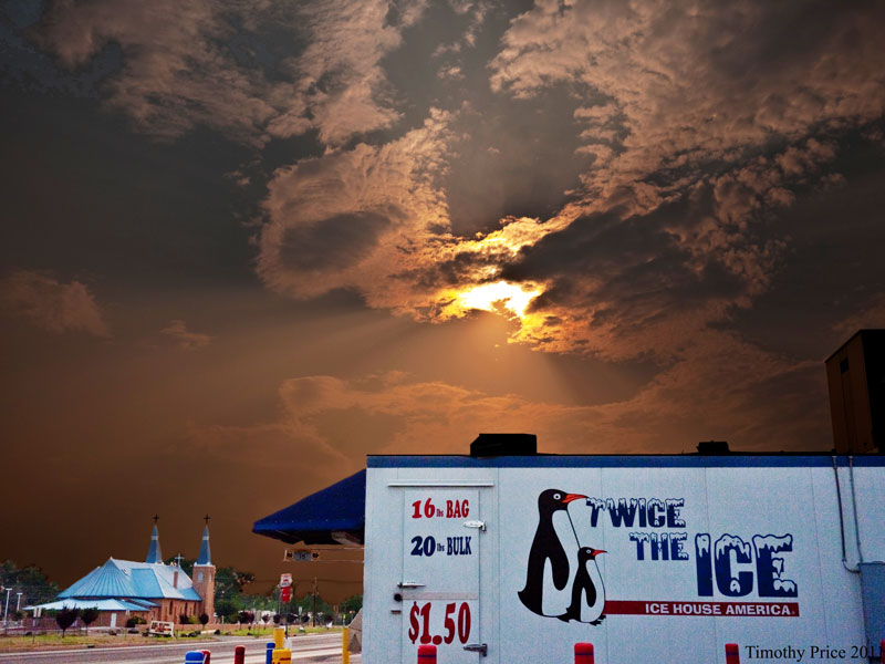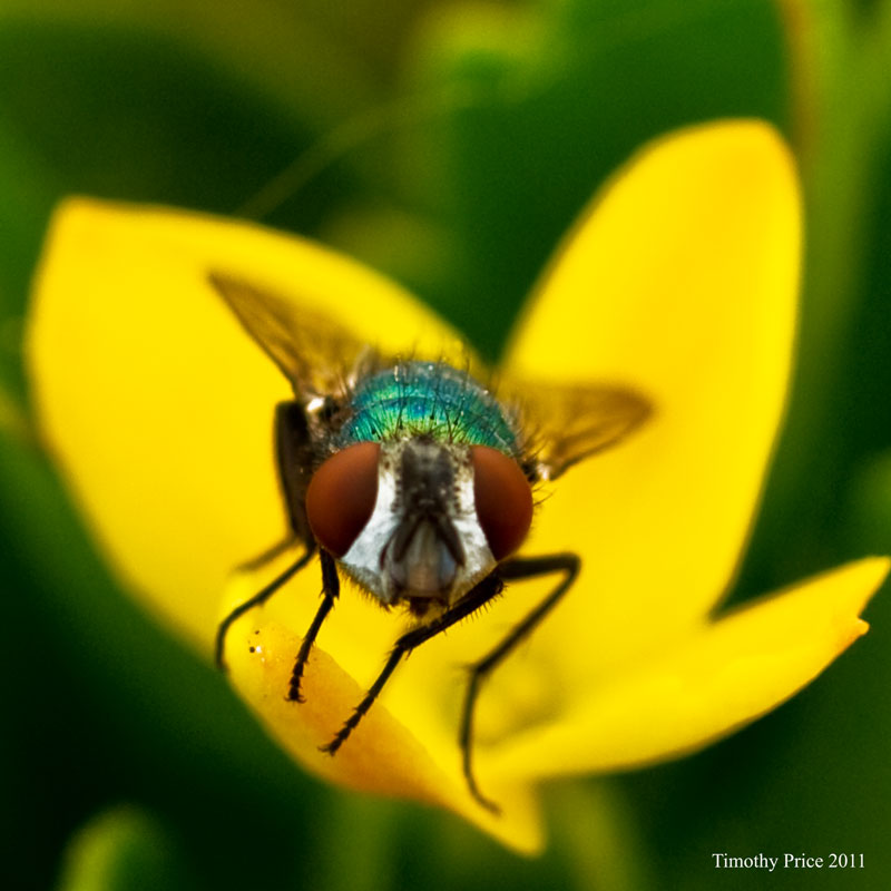 Originally posted June 14, 2011: The smoke was blowing in on my way home tonight and the sky looked interesting at the light at Alameda and 2nd Street, so I pulled off at the little ice house and got a photo of the cloudy, smoky sky with ice ads in the foreground. Laurie found a porcupine quill in Puck’s fur tonight. I’ll photograph it tomorrow, but this porcupine might end up being a problem. I thought the cats had enough sense not to mess with them, but maybe not. Their instinct to go after rodents, even though the rodents are three times larger and very prickly, might just be too much for their kitty sense. At least Puck’s kitty sense, apparently. He tries to be a tough cat, but messing with porcupines is a bit much. Then there are flies with major attitude, like the one pictured tonight. This fly was ready to take on the camera lens, or maybe its own reflection in the filter was getting it riled up, but it was ready to fight one way or the other.