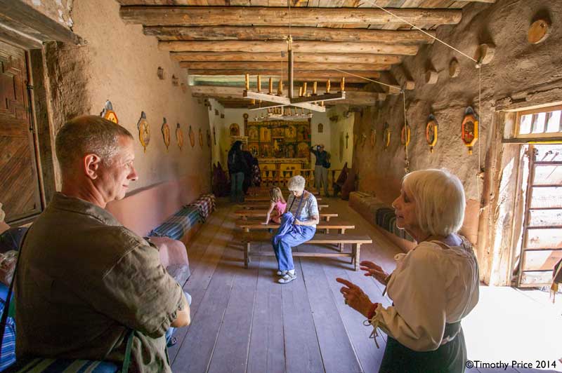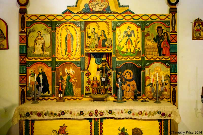 The interior of the church has simple benches for pews, an artisan crafted retablo at the altar, and hand carved Stations of the Cross (the Stations of the Cross are a modern addition, according to a docent).